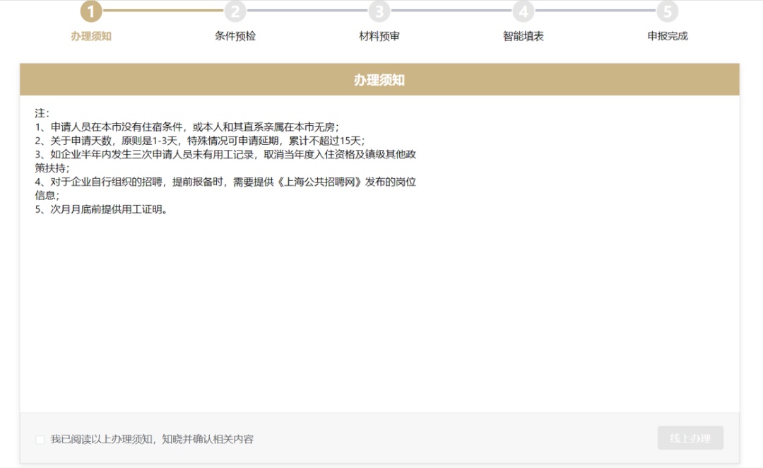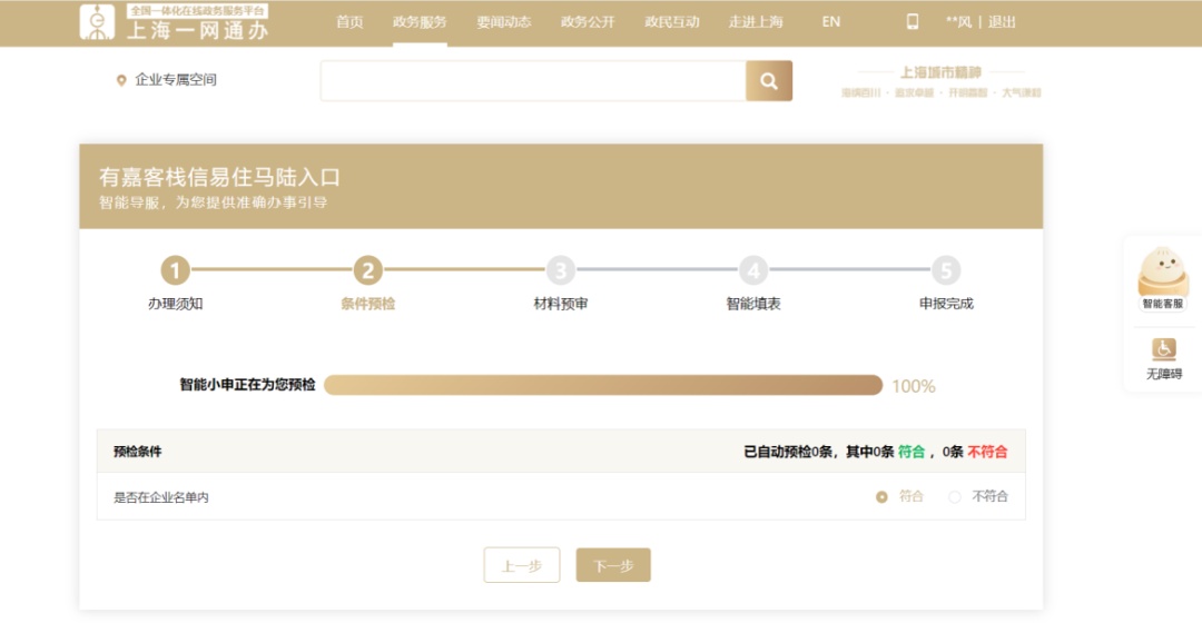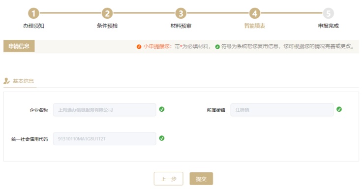 如果用户的企业符合办理该事项的全部条件,用户可以点击页面下方的【下一步】按钮进入到下一个流程环节。也可点击【上一步】按钮回到办理须知页面。