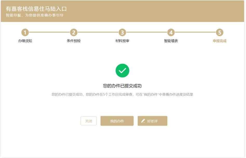 提交完成后用户需注意页面中的内容信息,本次办件会在多少个工作日内完成审查。浏览完毕后可点击页面下方的【关闭】按钮回到首页,也可点击【我的办件】按钮前往查看企业的办件。