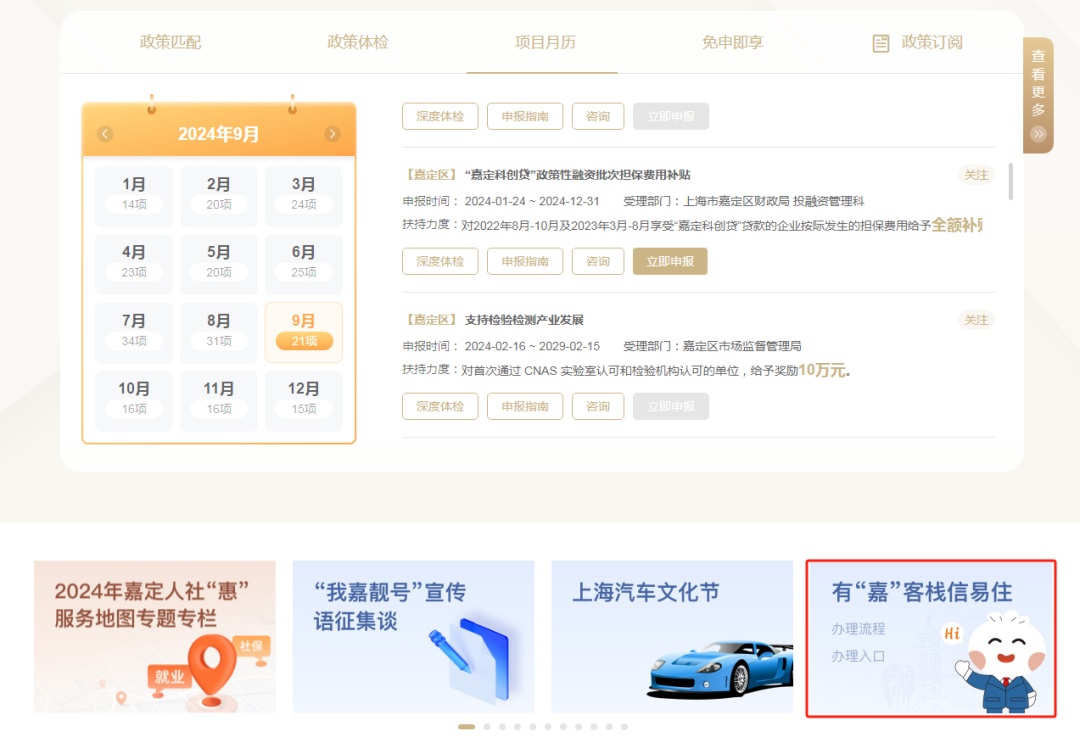 用户登录至一网通办,在嘉定企业专属空间中找到【有“嘉”客栈信易住】的入口 ,点击后即可进入到专栏页面。