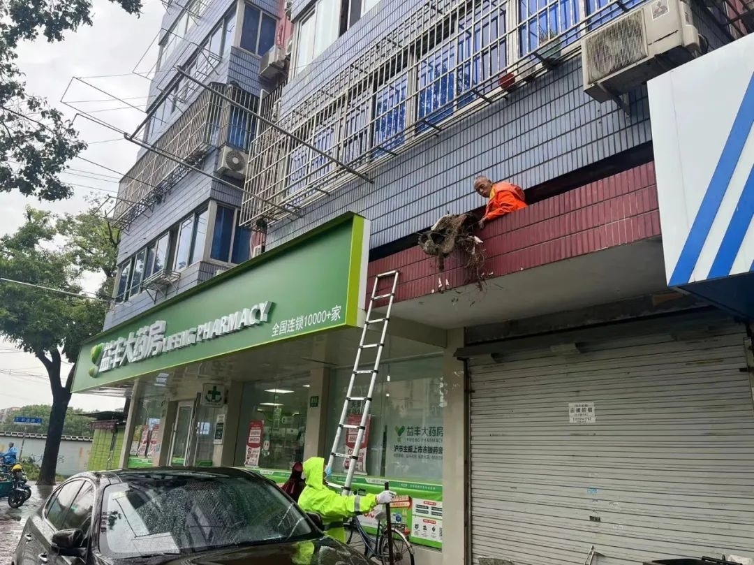 9月20日清晨,朱泾镇红菱居民区工作人员冒雨挨个检查小区内部道路上的雨污水篦子,对沿街商铺屋顶积水情况进行排查。为了防止屋顶积水引起的问题,居委会工作人员会同物业人员逐个对商铺的屋顶开展清理,楼上楼下做好垃圾的转运工作。