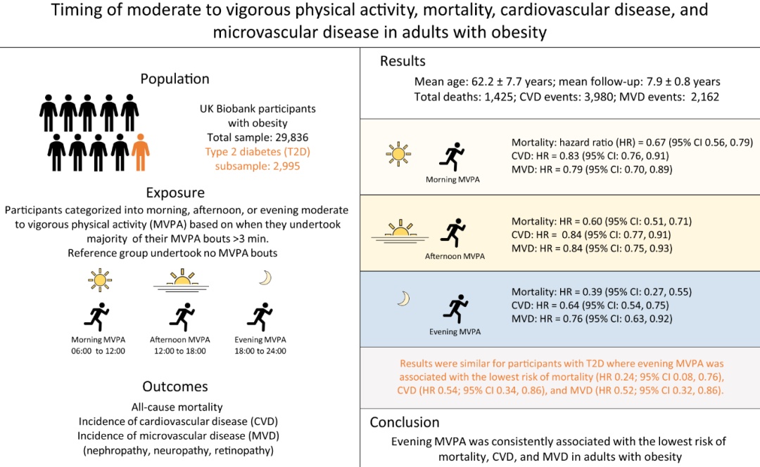 并且,运动强度和运动量也会对不同时间点的运动风险产生影响。有研究发现,对于肥胖患者以及合并2型糖尿病的肥胖患者来说,选择晚上进行中高强度有氧运动发生心血管疾病的风险最低。