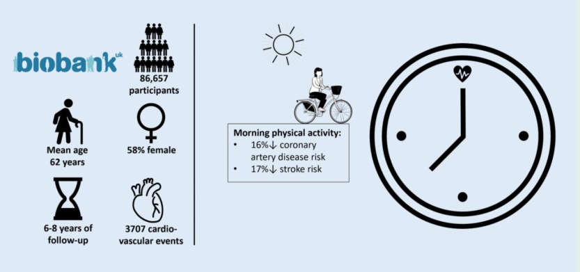 对于一些高风险人群,运动时间点的选择就更需谨慎。一项纳入86657名被调查者的研究发现,无论总身体活动量如何,早晨进行体力活动发生心血管疾病(中风、冠心病、缺血性中风)的风险更低,这凸显了运动时间点在预防心血管疾病中的潜在重要性。
