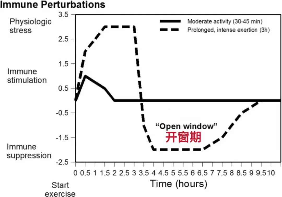 《体育科学杂志》上发表的一项研究显示,适度运动(实线)30~45分钟,免疫反应会持续增加;但持续高强度运动(虚线)超过3小时,免疫反应在短暂增强后,会开始走下坡路,超过3.5小时,则会诱发免疫抑制,也就是免疫系统此时可能会进入“开窗期”。