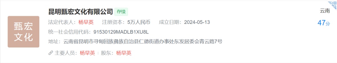 天眼查显示,杨早英名下企业注册地为云南省昆明市寻甸县。