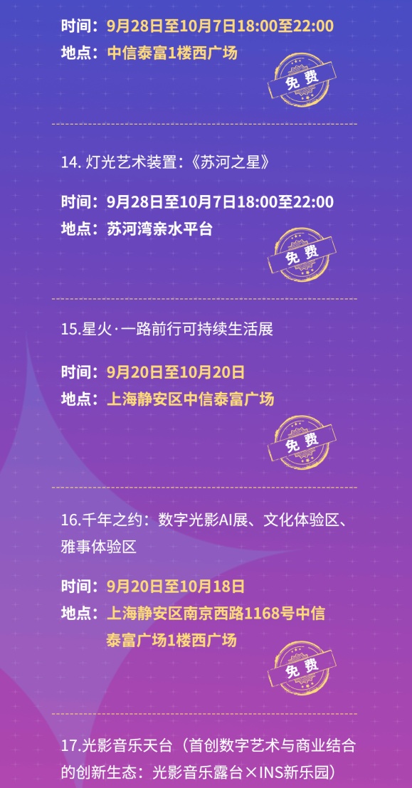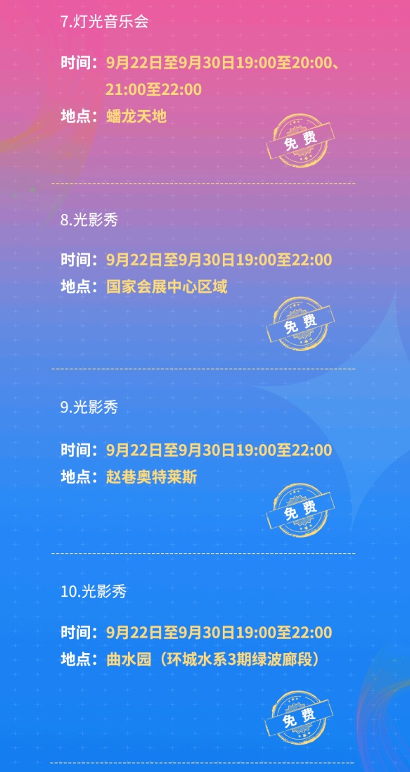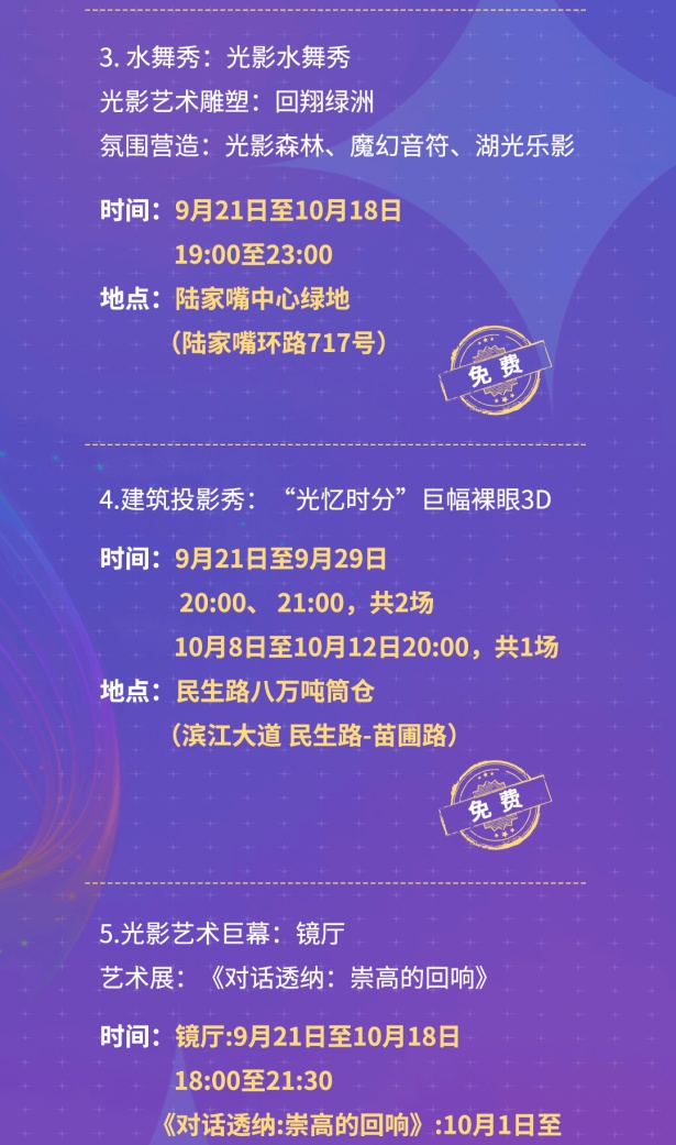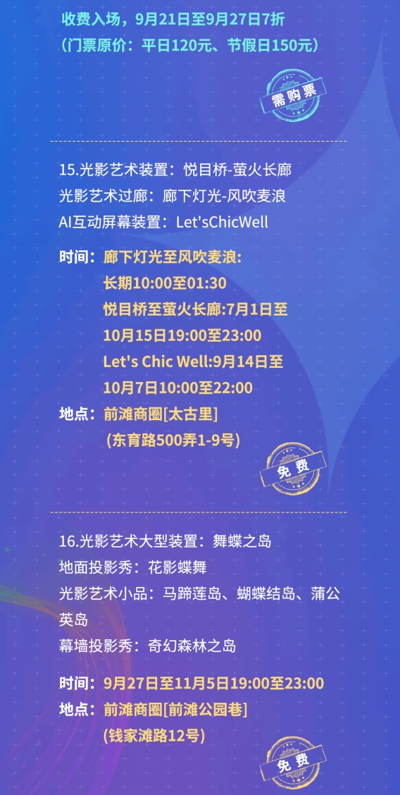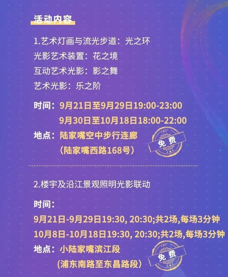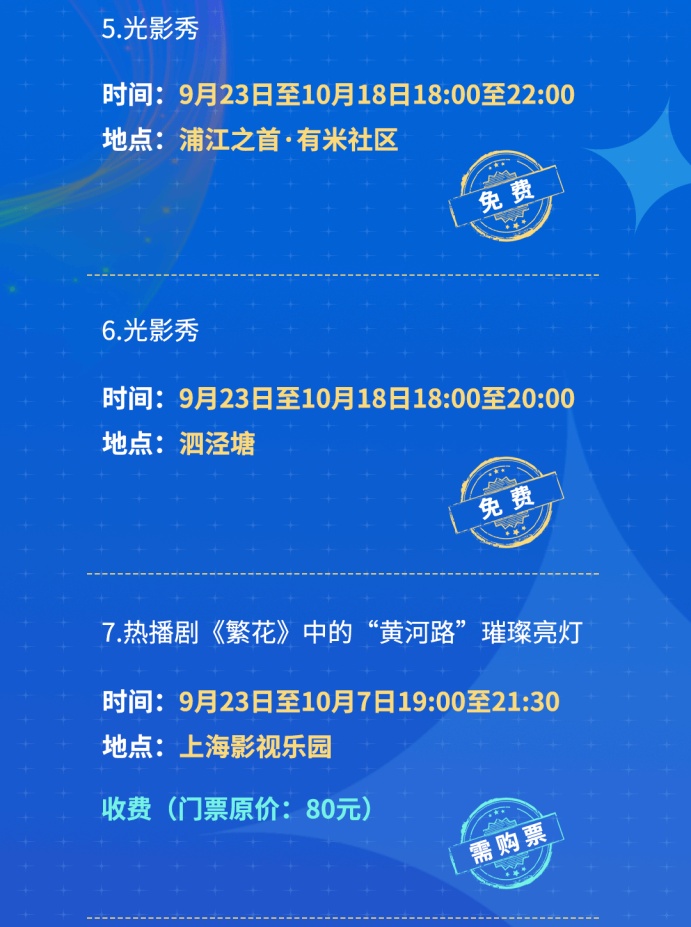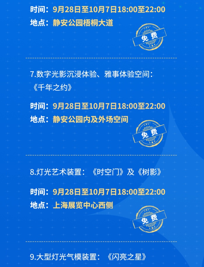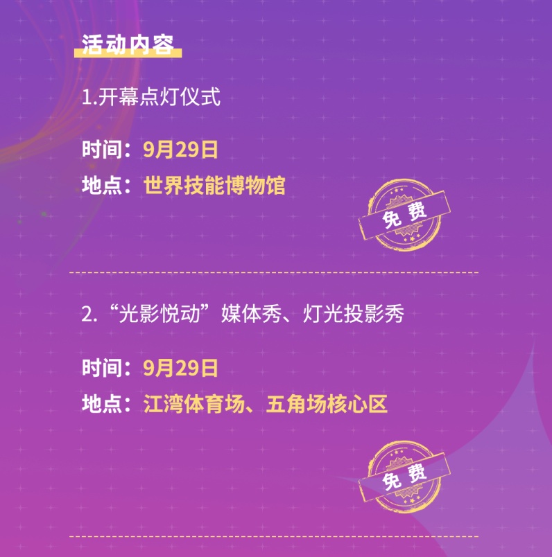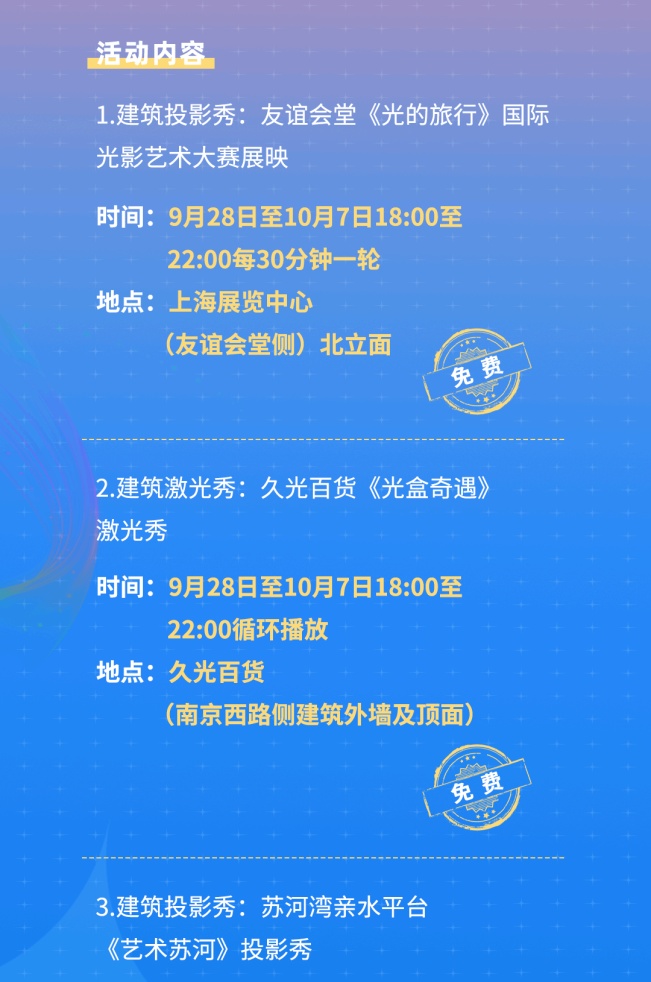 本次活动共开展建筑投影秀、光影秀、光影艺术装置展、灯光音乐会、花车巡游、文化艺术展等129场活动,涉及重要商圈、公共文化设施、主要旅游景区、重要交通枢纽、市级公共体育场馆、大型展览场馆、公园绿地等商旅文体展场所119处。具体活动信息详见↓