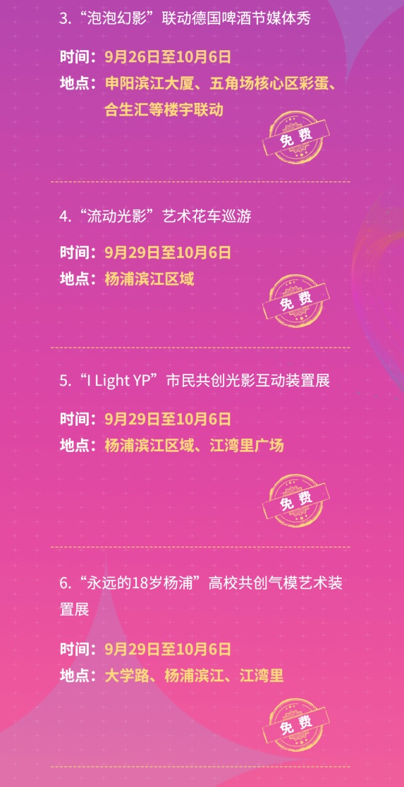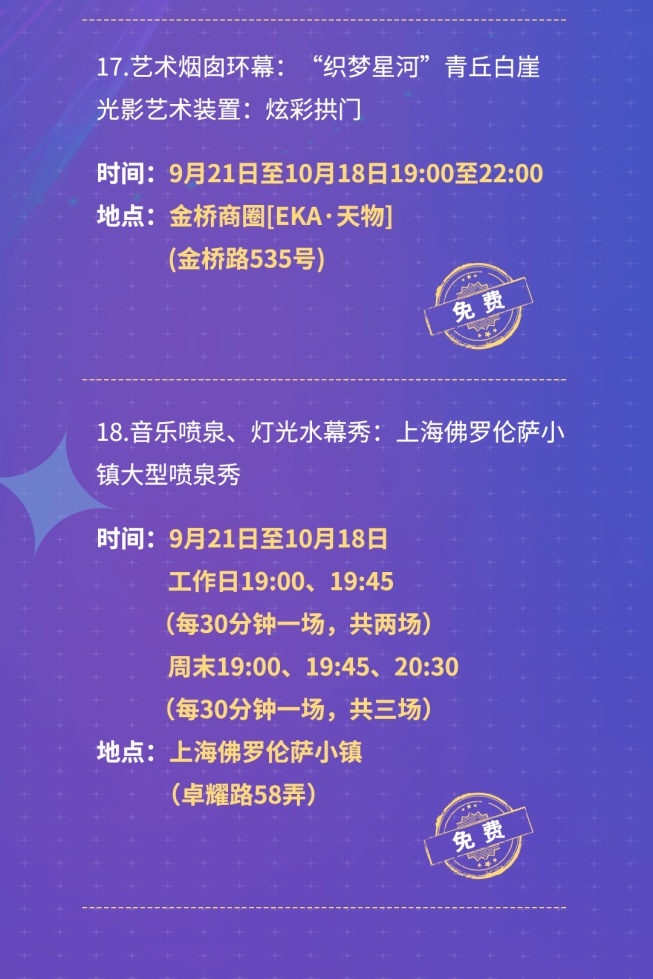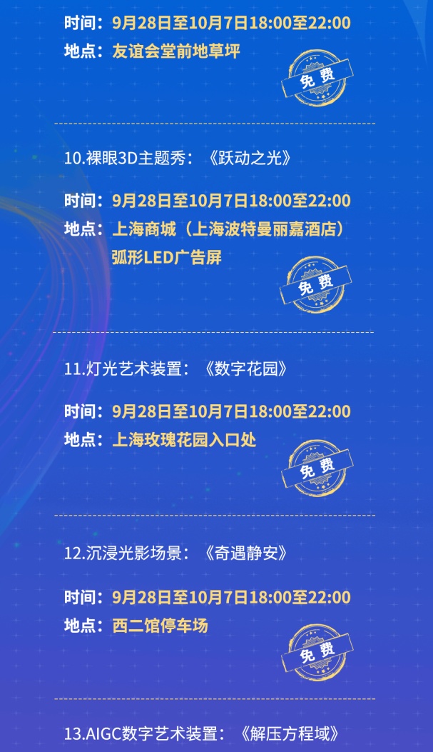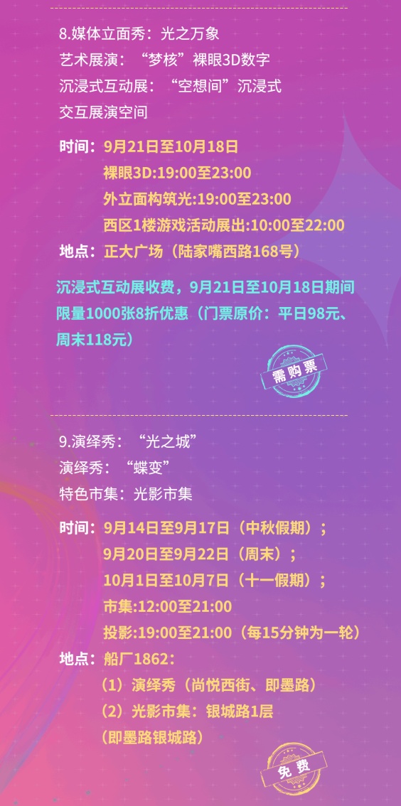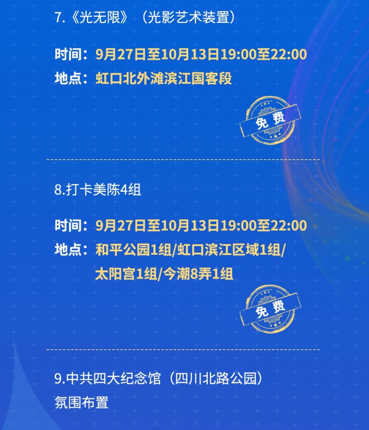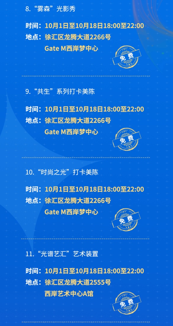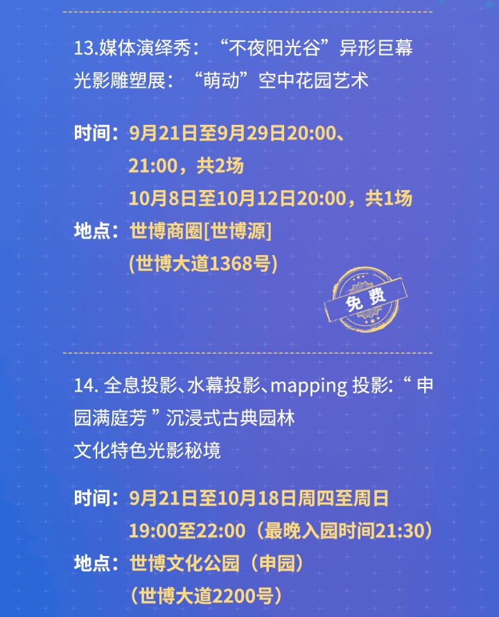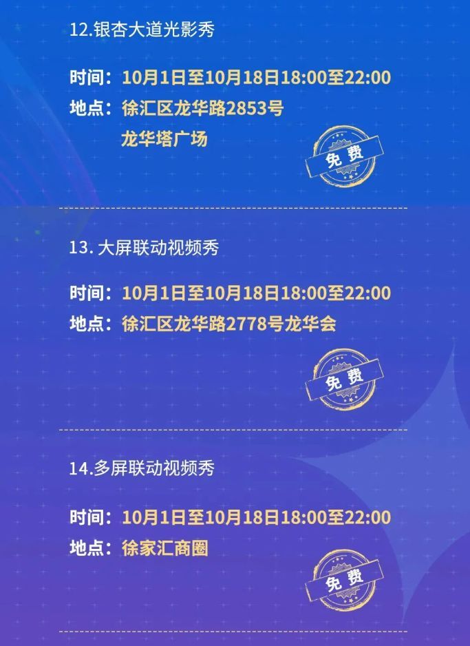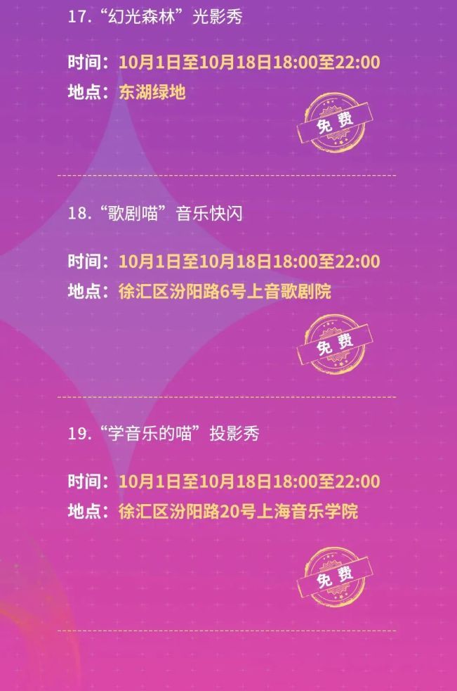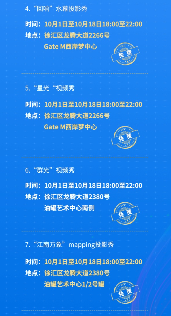 本次活动共开展建筑投影秀、光影秀、光影艺术装置展、灯光音乐会、花车巡游、文化艺术展等129场活动,涉及重要商圈、公共文化设施、主要旅游景区、重要交通枢纽、市级公共体育场馆、大型展览场馆、公园绿地等商旅文体展场所119处。具体活动信息详见↓