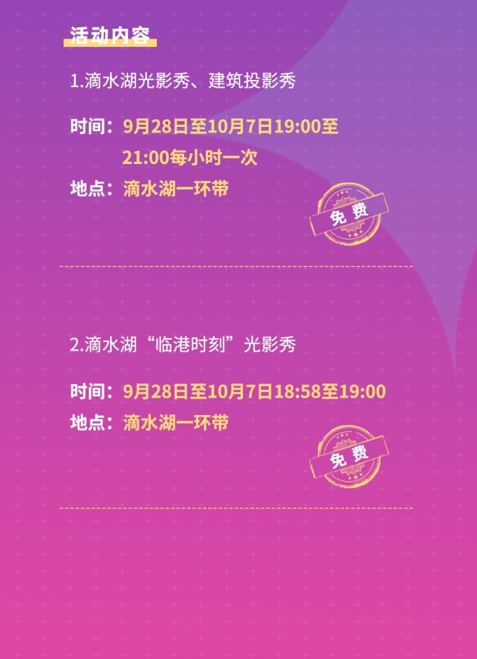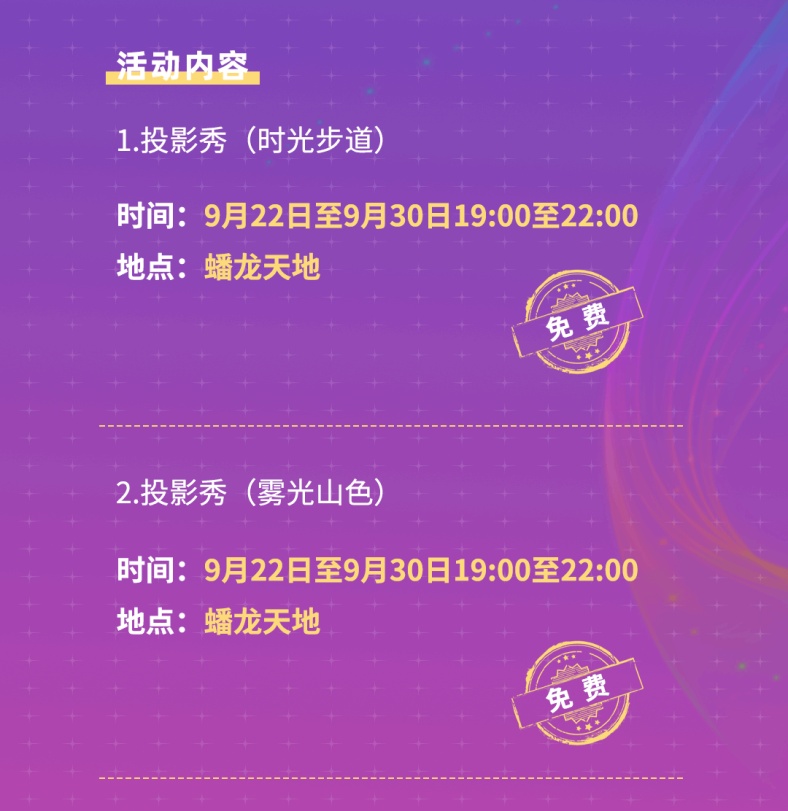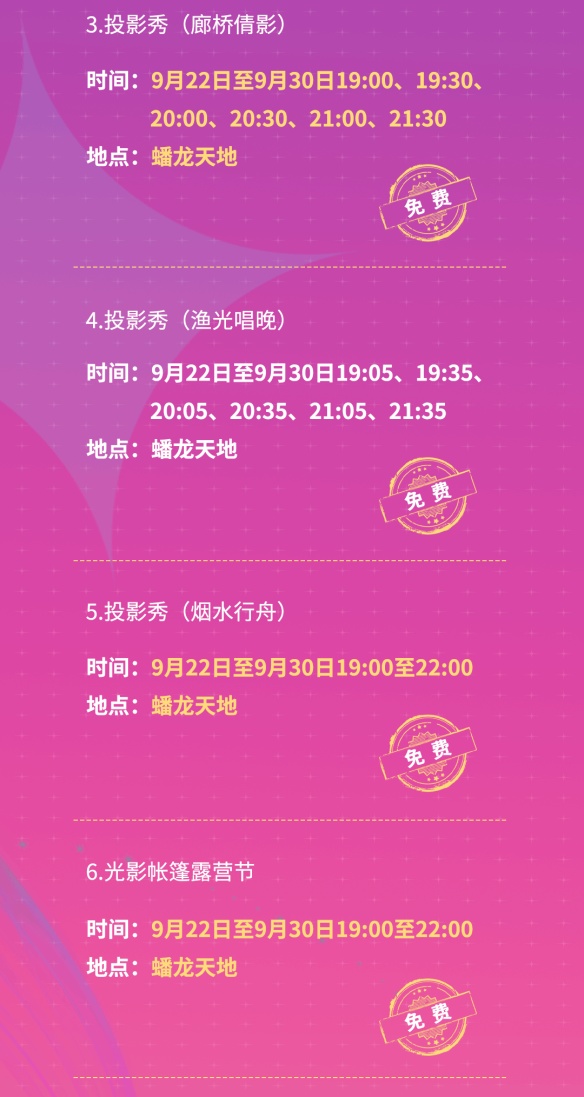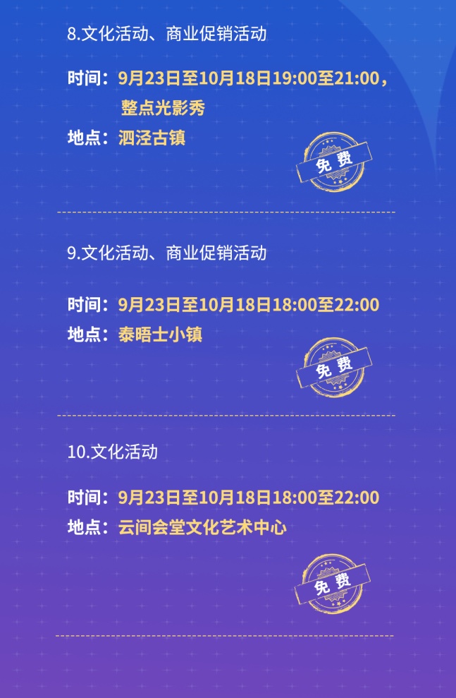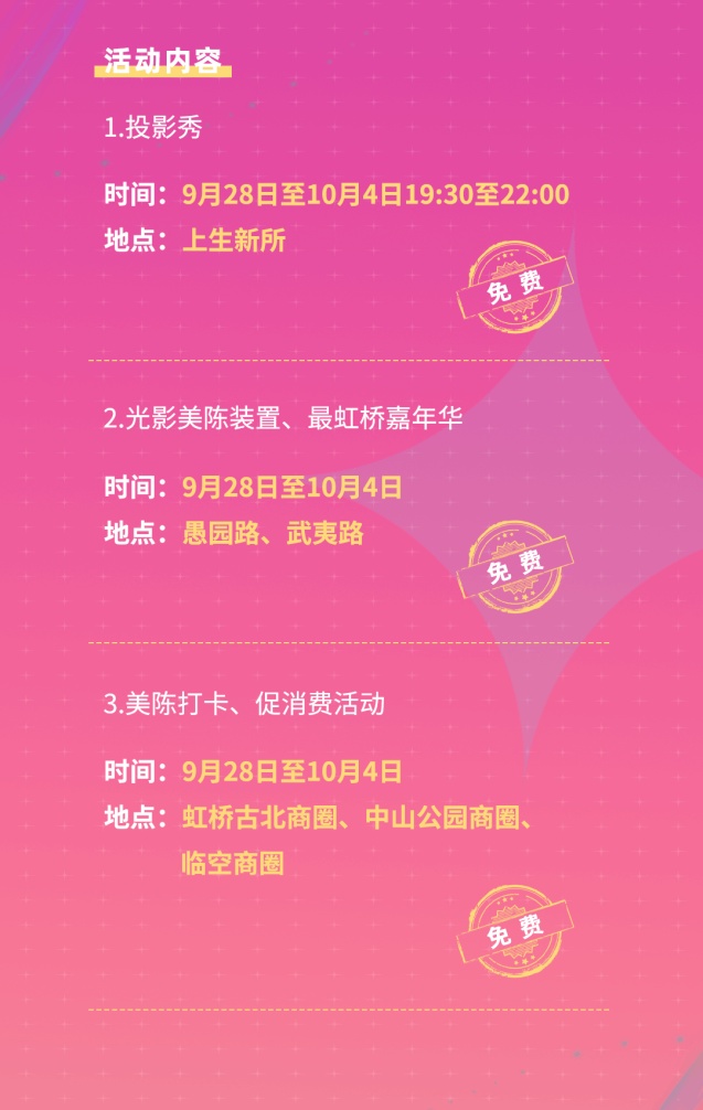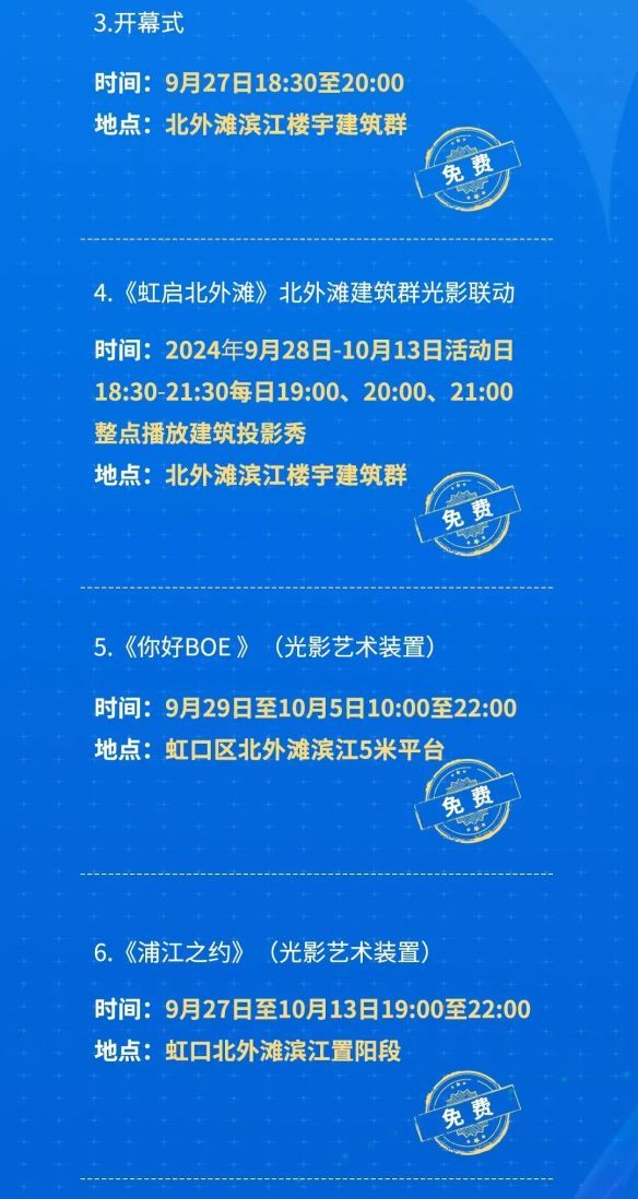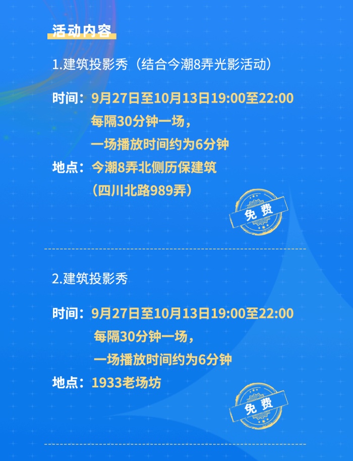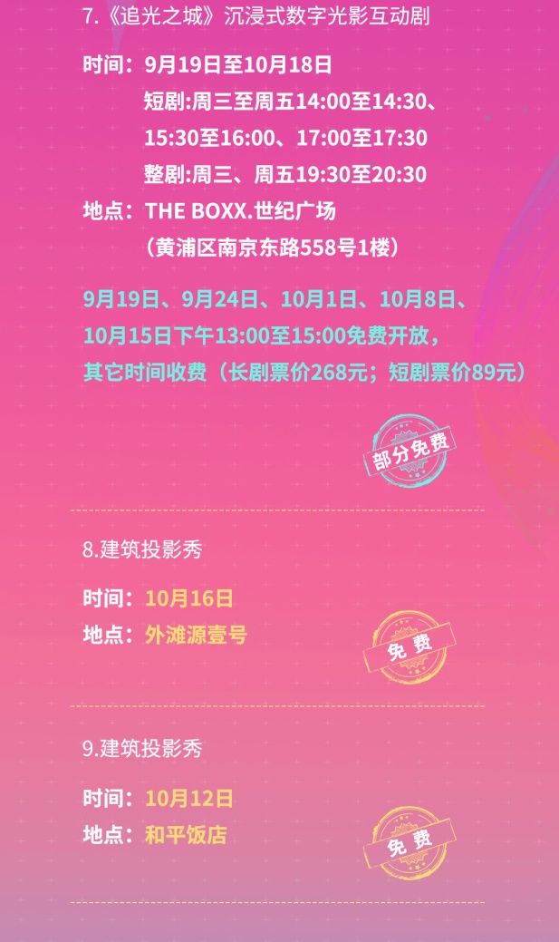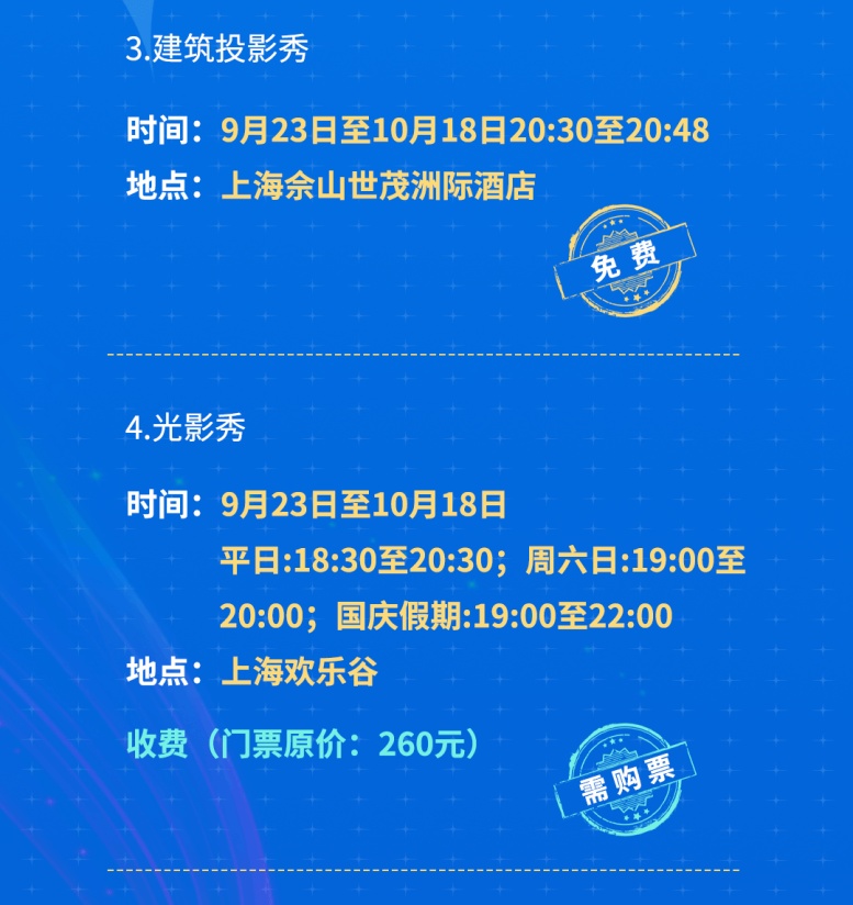 本次活动共开展建筑投影秀、光影秀、光影艺术装置展、灯光音乐会、花车巡游、文化艺术展等129场活动,涉及重要商圈、公共文化设施、主要旅游景区、重要交通枢纽、市级公共体育场馆、大型展览场馆、公园绿地等商旅文体展场所119处。具体活动信息详见↓