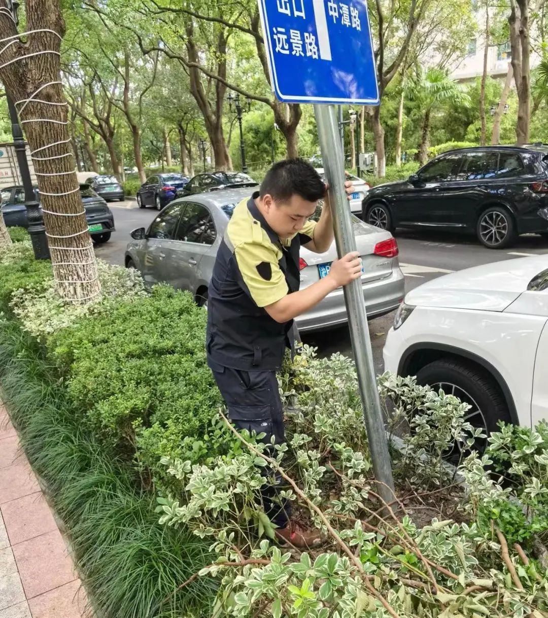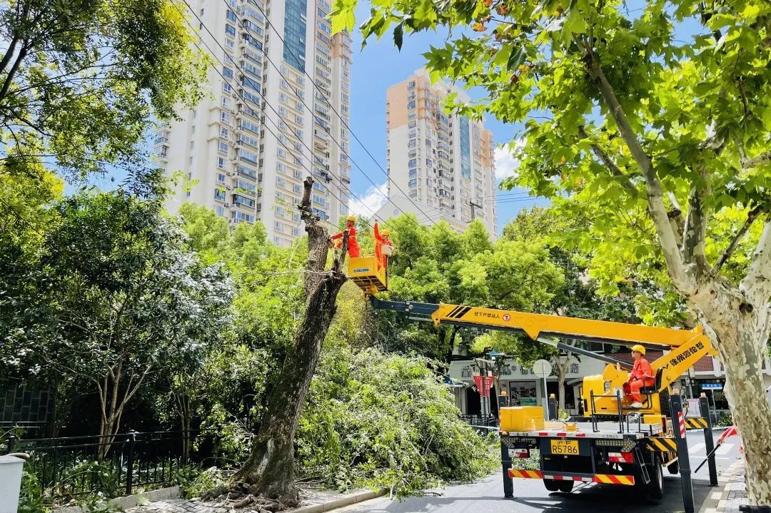 金锐公司对淮海中路、瑞金二路、永嘉路、绍兴路等沿线行道树实施补充修剪,防止倒伏摧折,对公园绿地倾斜倒伏大树及时扶正加固。
