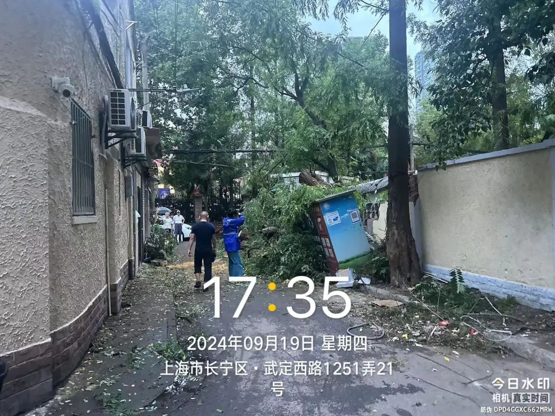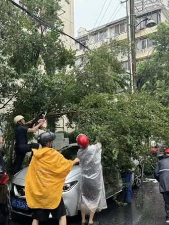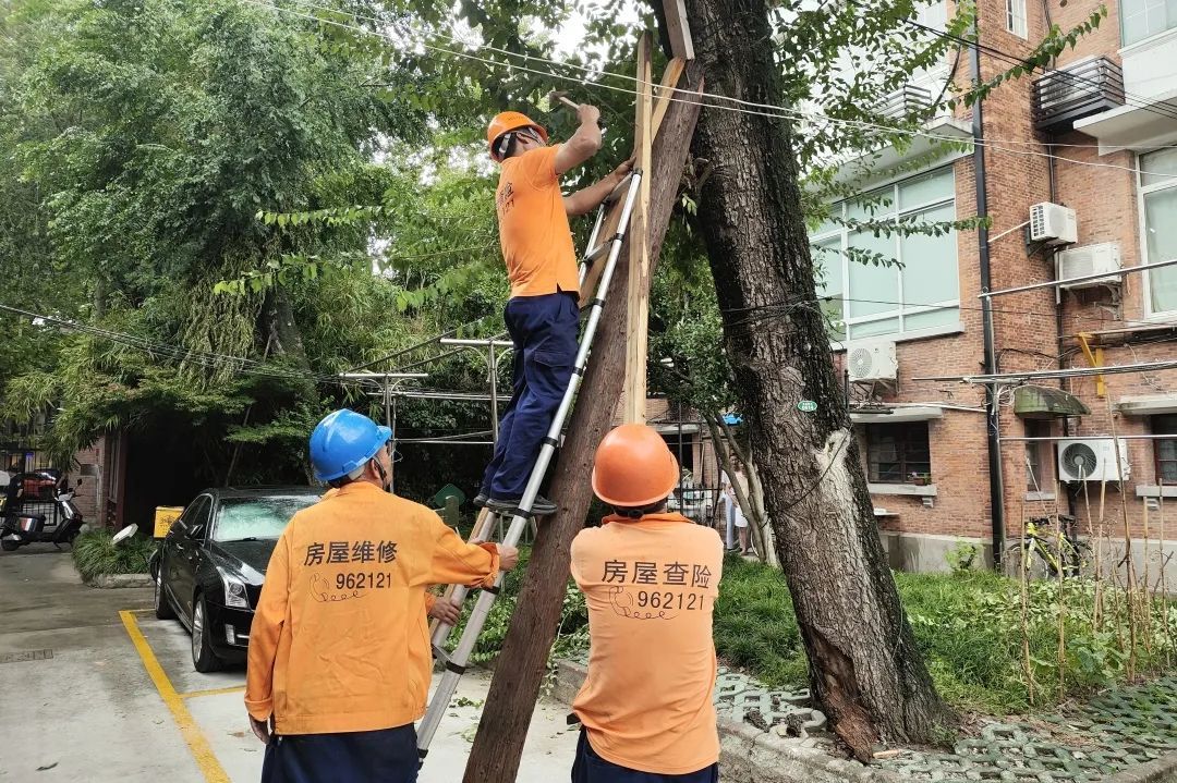 应急中心会同消防、街道、居委、公房公司等锯除长乐路81号小区、泰康路原水小区内倒伏大树,修复损坏房屋,消除电线短路隐患。