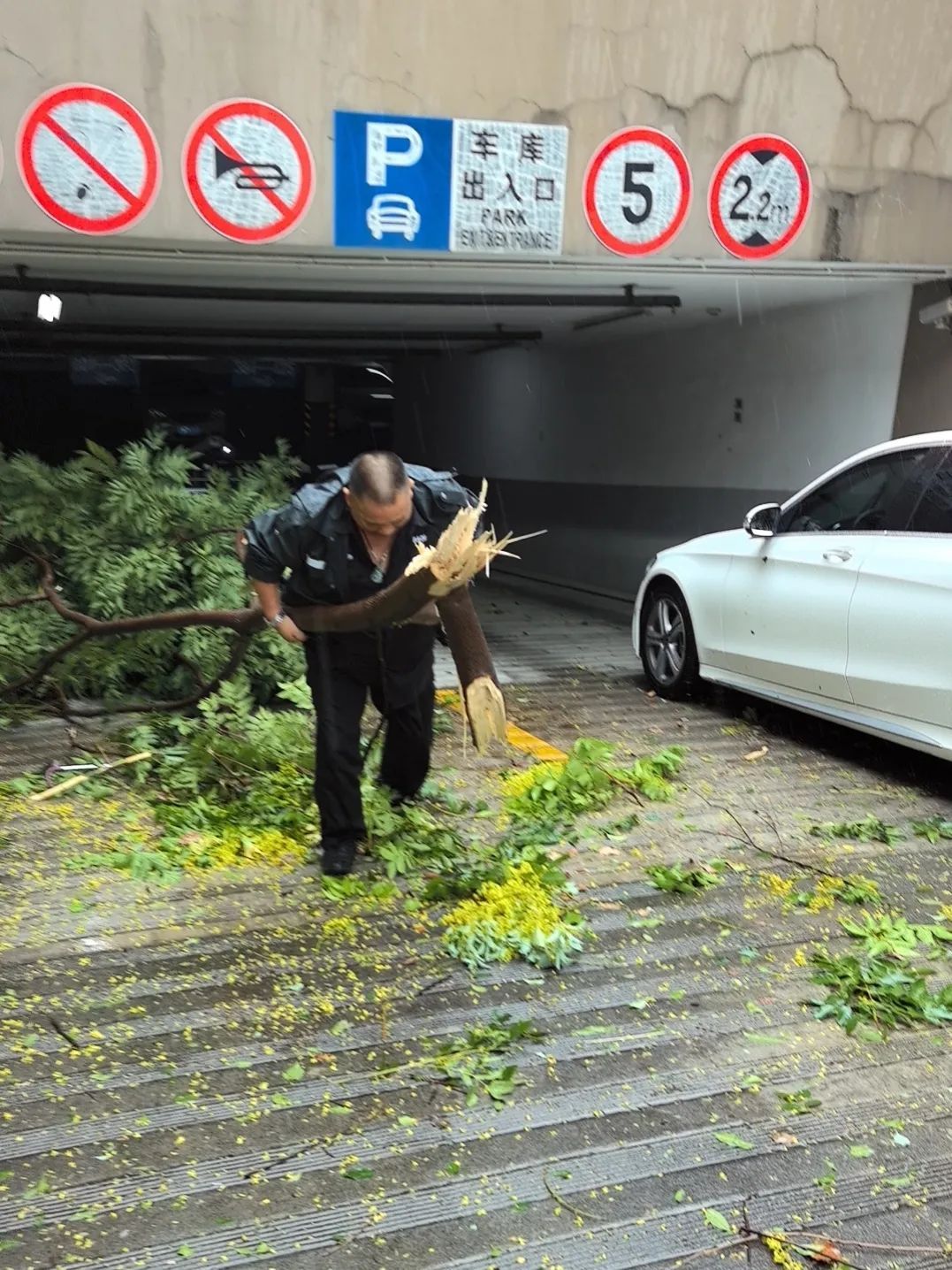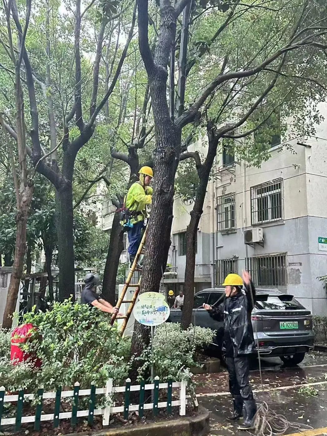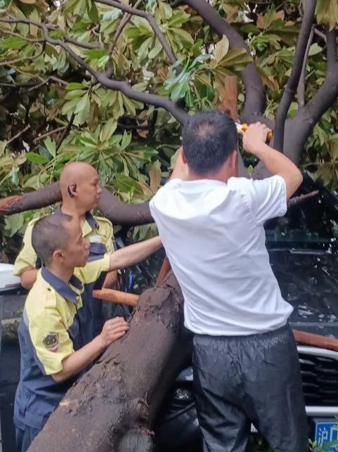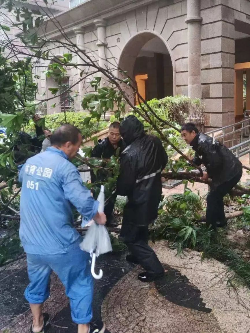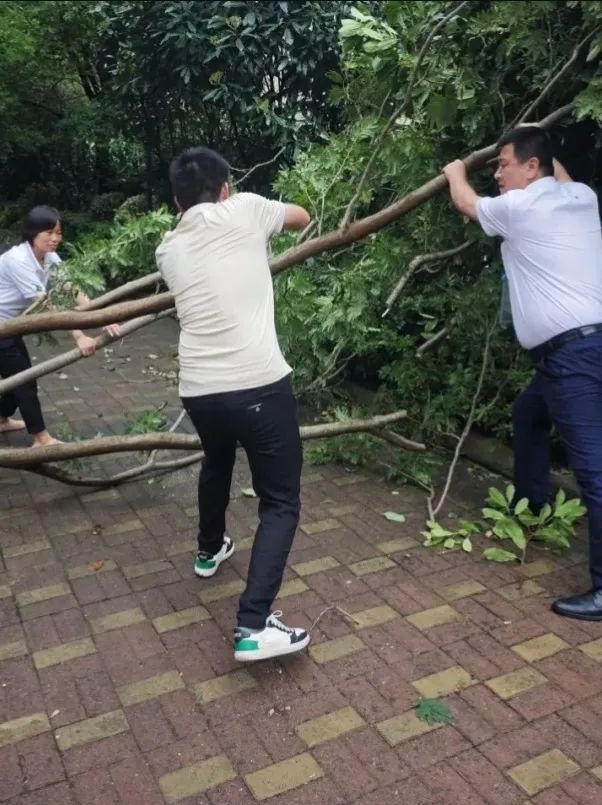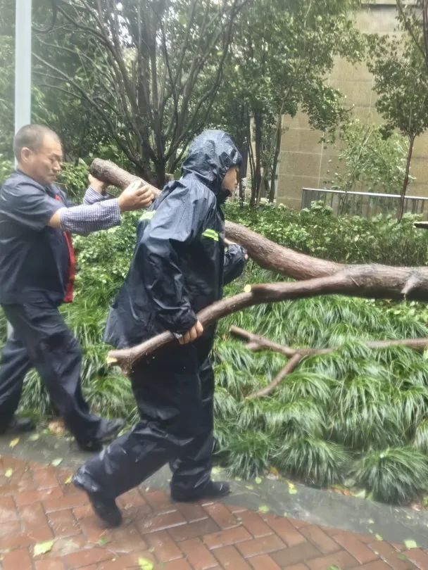 9月19日晚,分布在各个区域的物业人员更是舍小家为大家,24小时驻扎守卫小区,坚守一线抗击台风。他们通过巡查、微信群等,实时掌握小区情况,随时准备投入到应急维修、渗漏水抢修等应急处置工作中,为台风期间的安全筑起坚实防线,最大限度地减少台风带来的不良影响。有一些小区出现树木倒伏的情况,物业人员及时处置,移除树枝,防止伤到行人。