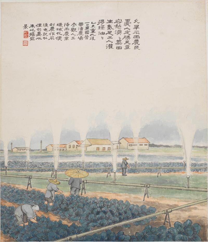 1955年重阳节之后,年已63岁、刚被聘为上海文史馆第一批馆员的著名画家朱屺瞻(1892~1996)来到王泥浜地区采风作画,切身感受刚走上合作化道路的农村新气象。他走进国营华漕农场参观,即被“人工降雨”的农业机械化场面所震撼,欣然挥笔创作了一幅实景写生画,取名《为了人民生活好》,并以俚句赞叹:“久旱无雨农民忧,人定胜天岂容愁。漠漠菜田生气足,人工灌得绿油油。”