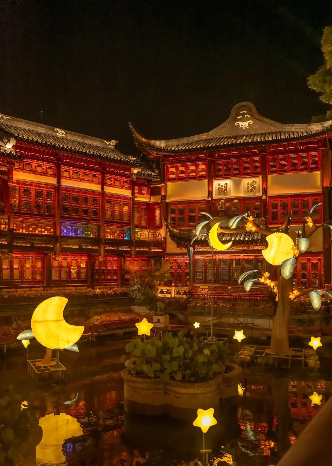 活动期间,整个豫园商城园区被仲秋主题灯组所点亮,为游客们呈现360°沉浸式游园的氛围。此外更有环绕在九曲桥边的楼宇动态泛光秀,值得一提的是,山海经萌宠“朏朏”,也化身为月光使者,与“月神”一起在豫园为游客们赐福。中心广场的“月印万川,处处皆圆”,以“镜”与“月”为设计元素,巧妙利用镜面折射,呈现“一月普现一切水,一切水月一月摄”之境。九曲桥的“四时有序,万物有时”灯组,则依托于《山海经》中常羲沐月的神话传说,将十二轮明月落于桥畔,让游客感受月圆月缺的光泽,体悟“人生自有闪光时”的哲学思想。凝晖路上再现龙年灯会上“一夜鱼龙舞”的盛景,无数璀璨繁星悬挂星空,营造“流星拂晓空”的绽放之美。