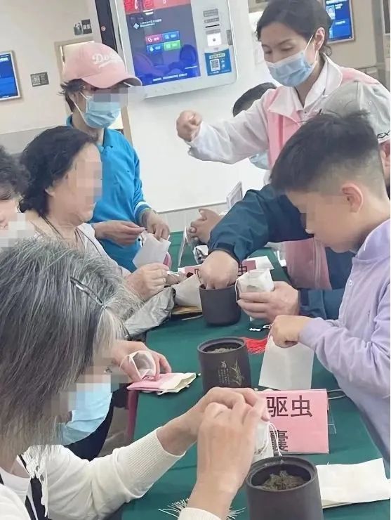 团队成员耐心细致地讲解了薄荷、肉桂、丁香、白芷、艾叶等多味药材的药材形状、性味归经、功能主治,带领居民探秘中草药的神秘世界。居民们通过触摸、观察、闻味等方式,了解每一味药材的药性及药效,并在指导下完成了自己的“战利品”香囊。