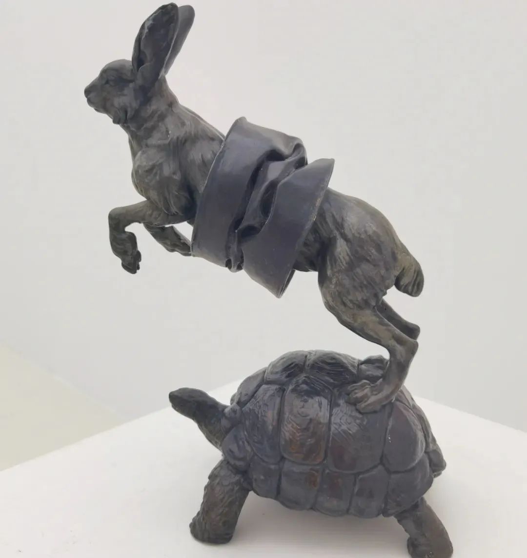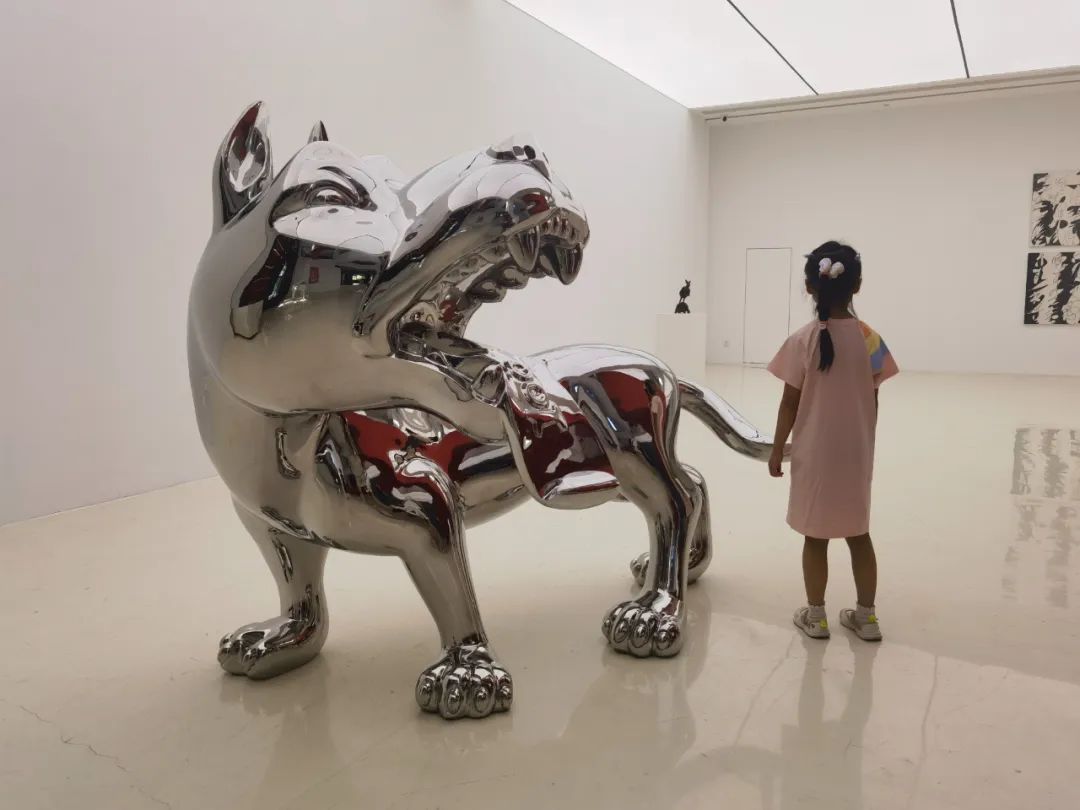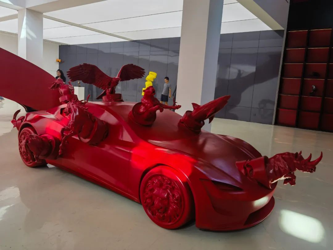 走进美术馆,一辆全身喷满红漆的树脂“轿车”十分醒目地立于正中央,海豚等动物正开心地从各个车窗中钻出头来挥手,仿佛刚刚完成一场愉快而刺激的冒险。“这是汽油桶系列中的一件作品,名叫《源动力车》。在工业文明时代,我感觉整个世界都是这种想拼命往外冲的状态。”任宏伟介绍,“汽车代表速度与激情,车上的乘客都在这趟旅程中感受到了疯狂,从而变得焦灼而脆弱。毫无疑问,这是工业化进程中遗留下的一种真实的对抗。而‘褶皱’的灵感来源于被踩扁的易拉罐,有挤压进去的,就有生长出来的。”