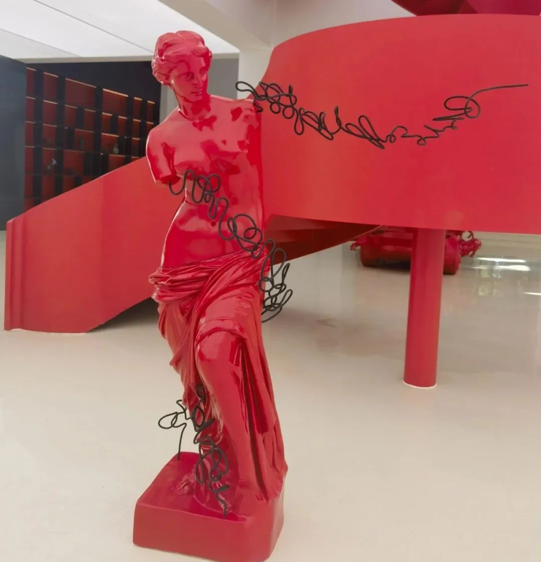 在这件作品背后,与旋转楼梯相隔而望的是一座断臂维纳斯,任宏伟介绍,上面“长”出的黑色金属丝其实是草书的唐诗“云想衣裳花想容”。“以雕塑装置为业的我研习书法20余年,书法几乎成了我业余的专业,是我应对寂寞的寄托,也是我把岁月打磨出的金线。”任宏伟说。在他今年的最新创作中,最大的亮点便是将平面的线性草书用金属丝来表达,使它们呈现于三维立体空间中,草书的内容均以传统东方诗词歌赋为主。这些作品大部分陈列在二楼的展厅中。