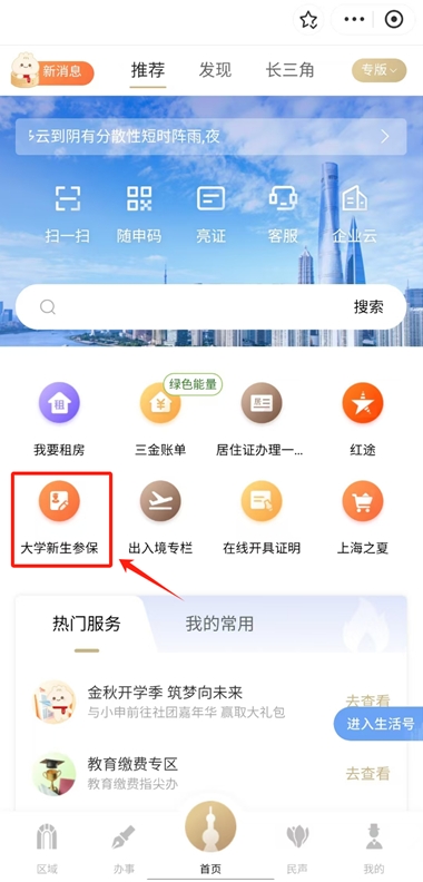 1.新生可打开“随申办市民云”(支付宝小程序、APP、微信小程序),首页点击“大学新生参保”服务。