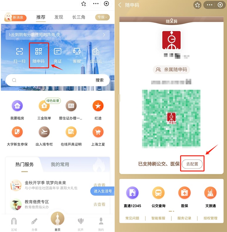 无需切换多个APP,带上“随申码”,开启随申码交通场景并签约支付渠道,就能轻松实现全市公交、地铁、轮渡一码畅行!快去试试吧~