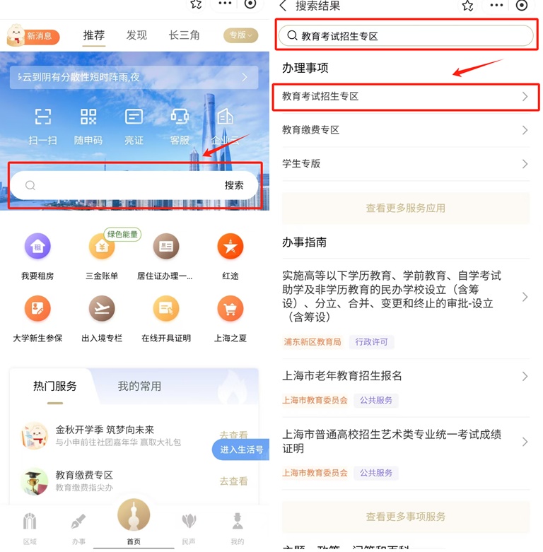 1.“随申办市民云”还为大家提供成绩证明服务,首页搜索“教育考试招生专区”进入。