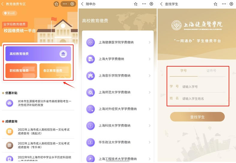 2.点击“高校教育缴费”入口,选择所在的学校,输入“学号和姓名”或者“证件号和姓名”,即可进行费用查询并且缴费。