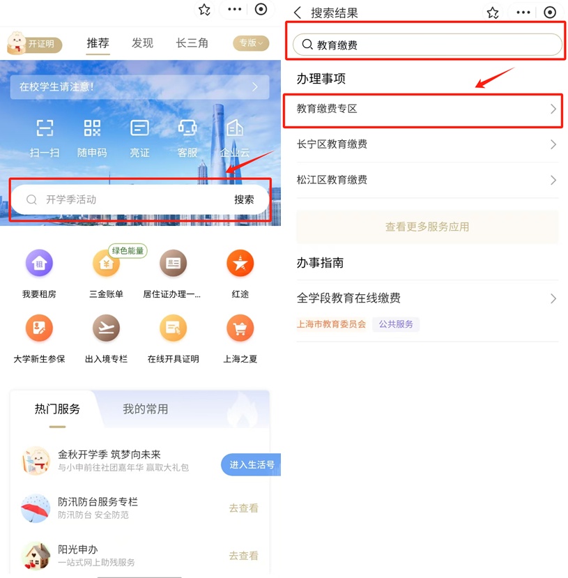 1.打开“随申办市民云”(支付宝小程序、APP、微信小程序),首页搜索“教育缴费”,点击进入“教育缴费专区”。