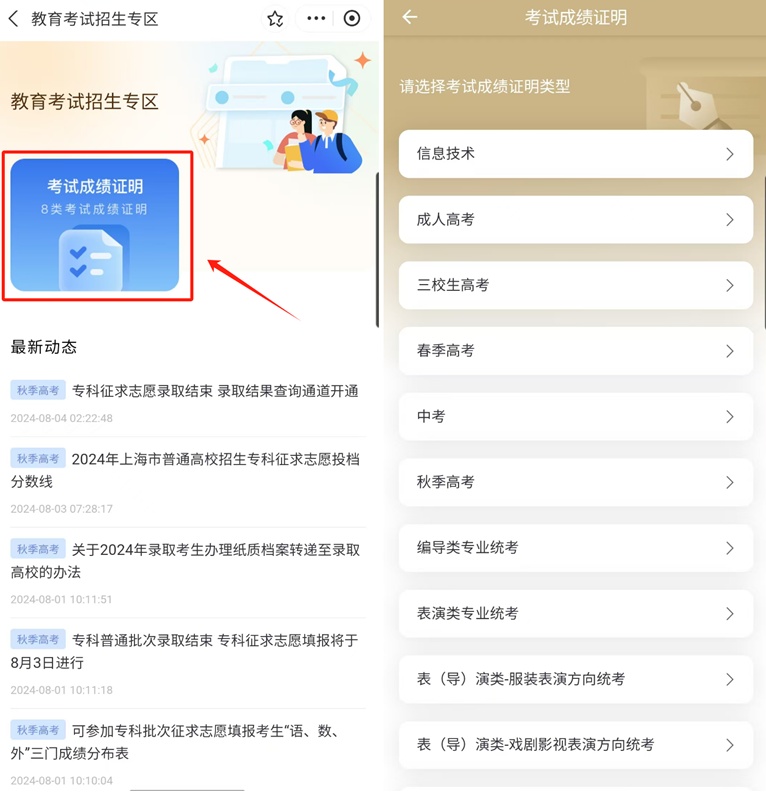 2.点击“考试成绩证明”板块,选择需办理的成绩证明,即可在线查询。