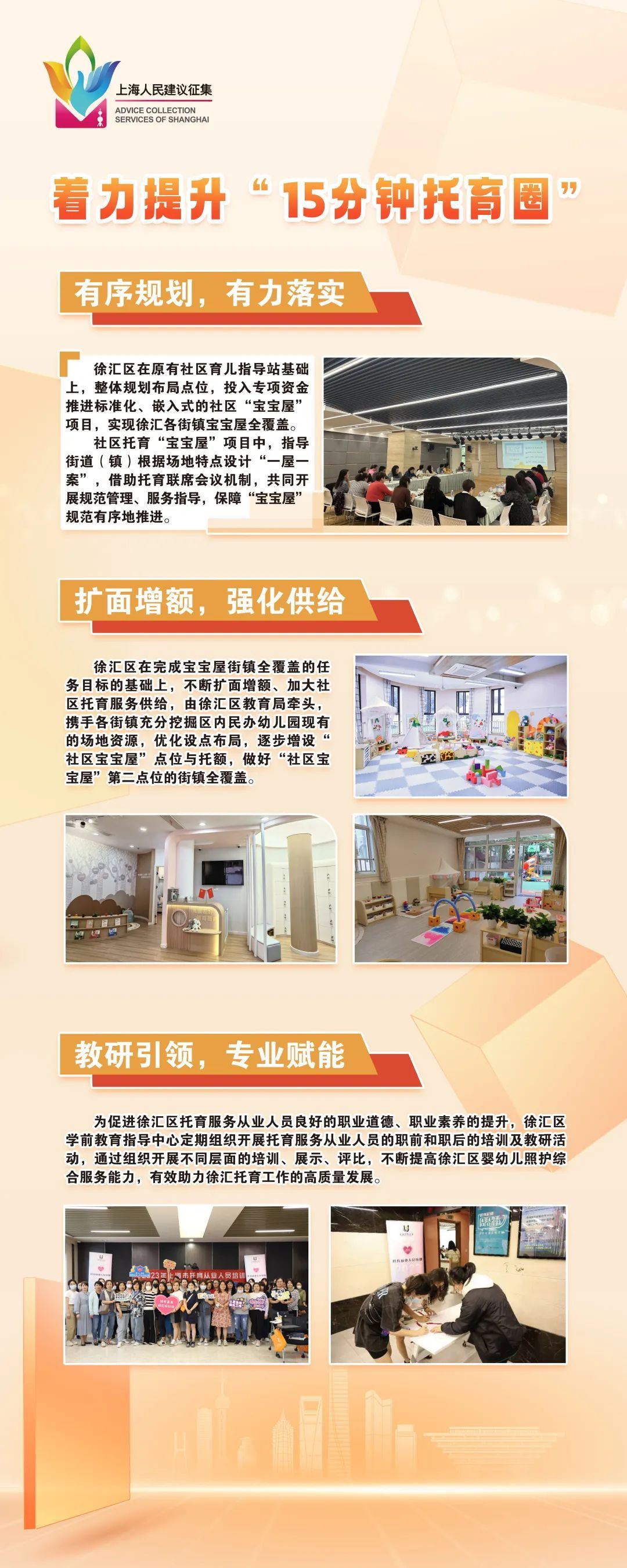在圆桌讨论的最后,社区居民积极提出了宝贵的意见和建议。有人建议通过建立社区家长交流群,增强家长之间的沟通交流,帮助他们互相解决育儿难题;也有居民提议,在托育服务的同时,为老年人提供更多的活动场所,实现“一老一小”共同服务的模式。增加托育服务时段与时长、提升普惠性托育点的覆盖面等建议也得到了与会者的广泛认可,不仅为徐汇区的托育服务提升提供了新的思路,也展示了各界对托育服务发展的高度关注。随着相关措施的逐步落实,徐汇区的“十五分钟托育圈”将进一步优化,真正实现优质、普惠、便捷的托育服务,为更多家庭提供支持和帮助。