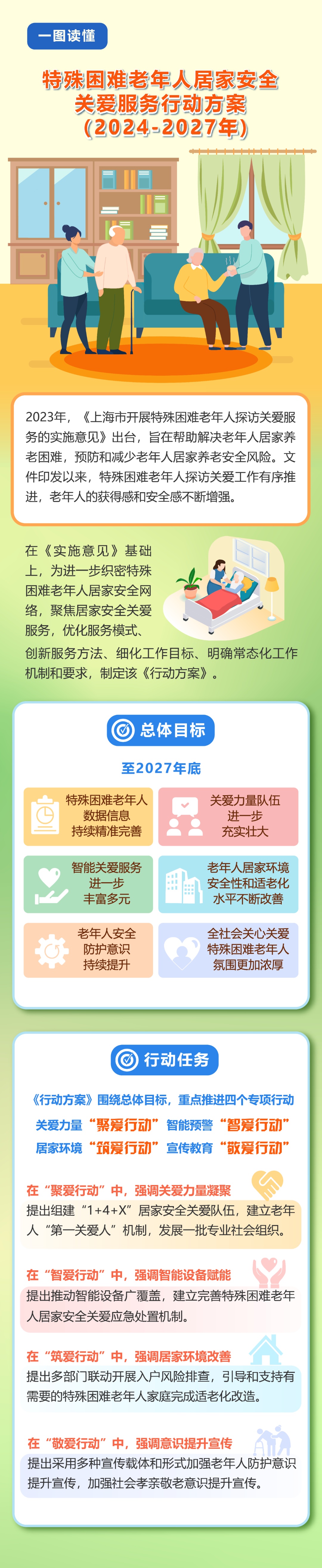特殊困难老年人关爱服务是各级党委政府和社会各界广泛关心的重要工作。为贯彻落实《关于开展特殊困难老年人探访关爱服务的指导意见》(民发〔2022〕73号)和《上海市开展特殊困难老年人探访关爱服务的实施意见》(沪民养老发〔2023〕7号)文件精神,市民政局聚焦特殊困难老年人居家安全关爱服务,结合本市工作实际,制定了《特殊困难老年人居家安全关爱服务行动方案(2024-2027年)》。详见↓