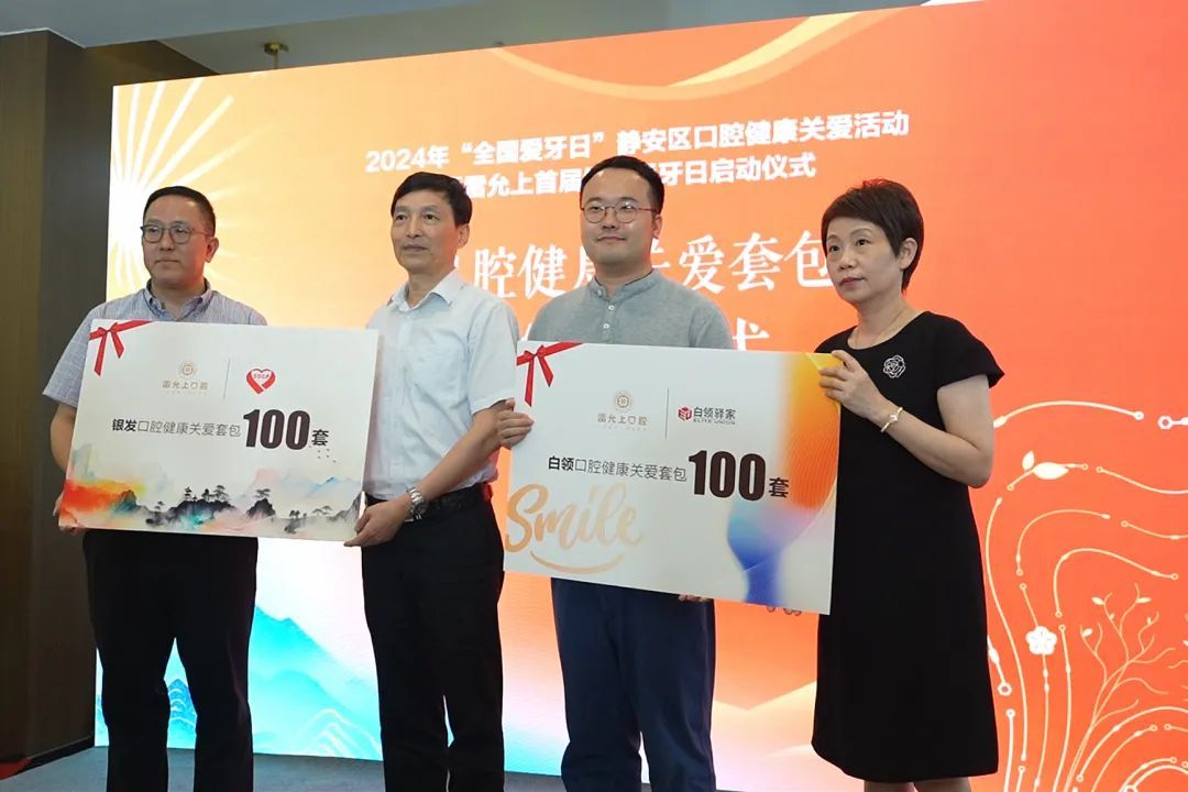 活动上,静安区牙病防治所和雷允上口腔分别向白领驿家、老年基金会代表赠送各100套口腔健康关爱套包。雷允上口腔也在“全国爱牙日”当天,通过与“上海静安”App官方平台的合作为三大人群提供免费口腔健康指导、免费CBCT口腔检查及全口超声波洁牙等多项服务的体验名额。