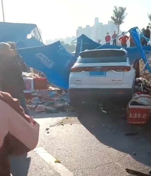 9月23日,甘肃省武威市凉州区金羊镇一路口附近发生交通事故,一辆小车冲进沿路菜摊中。