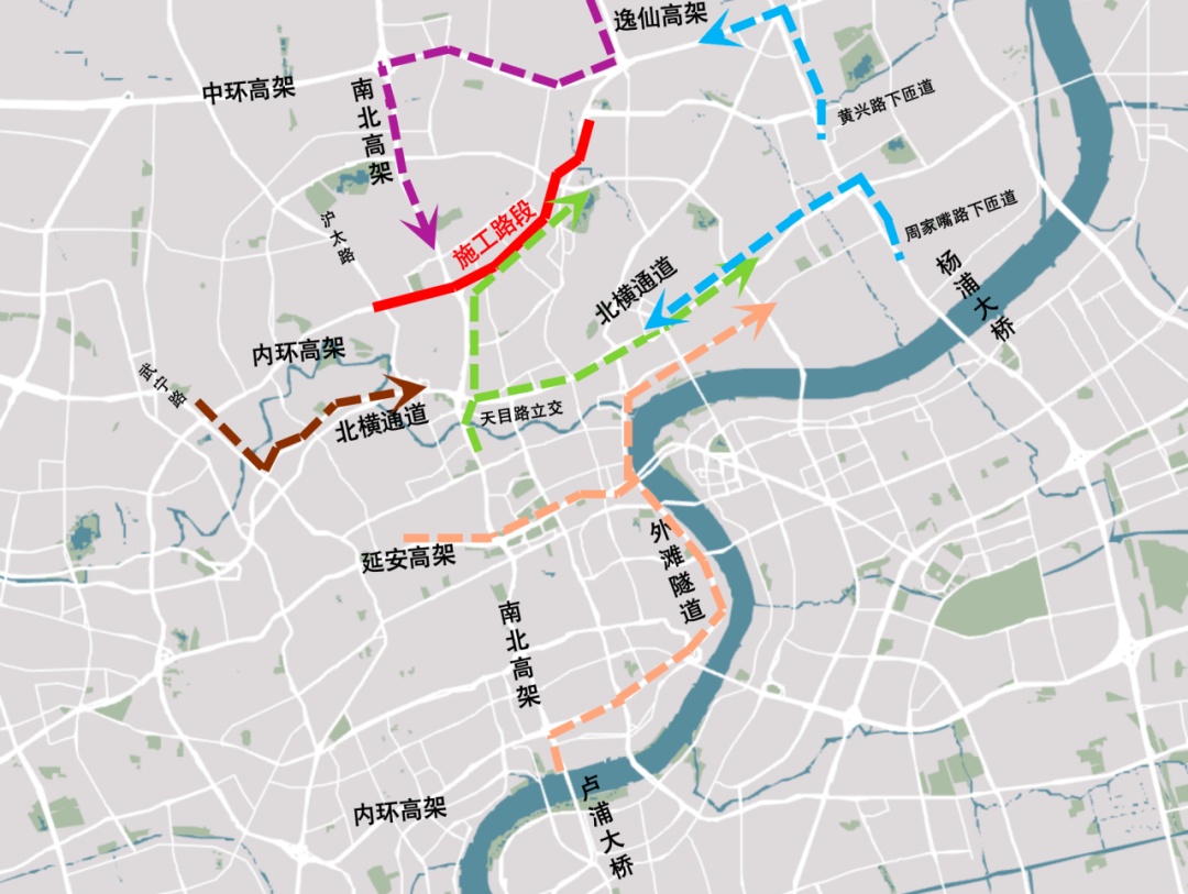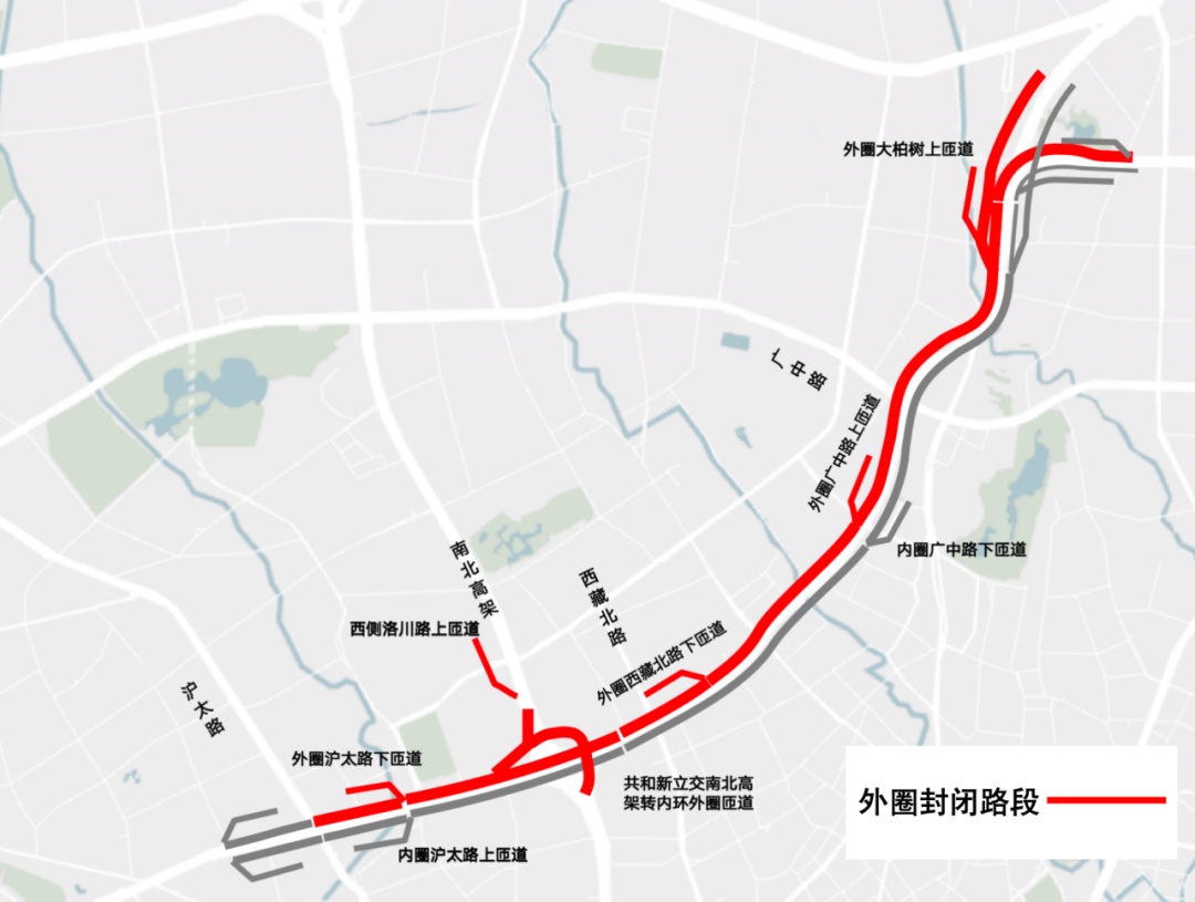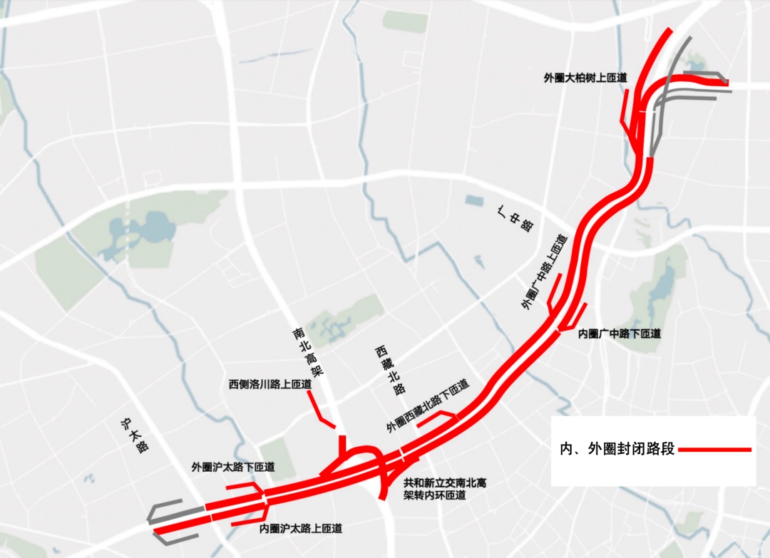 每周一至周四夜间24时至次日晨6时内环高架(沪太路至中山北二路)外圈主线封闭、共和新立交南北高架东、西侧往内环外圈匝道封闭、南北高架西侧洛川路上匝道封闭。