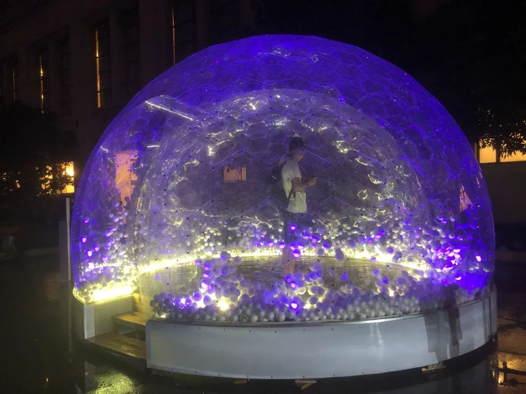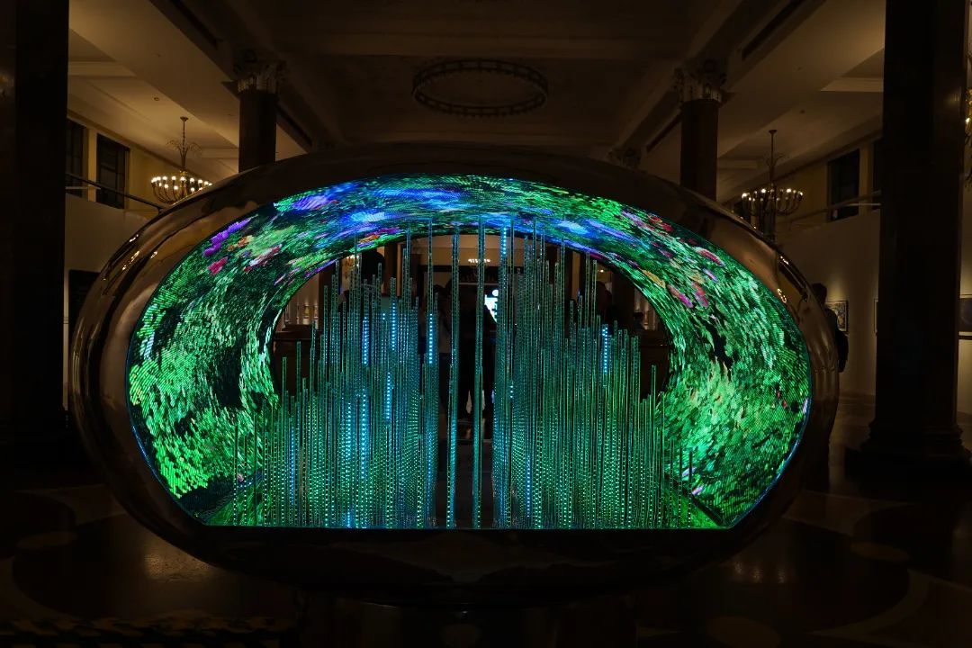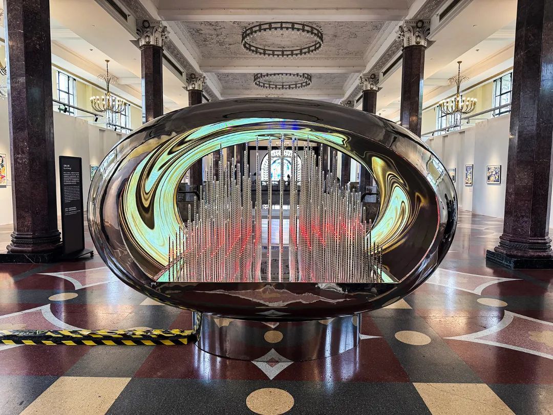 《时空穹宇·共鸣之心》由普陀区选送。装置灵感源于宇宙中的星云漩涡与自然界中广泛存在的共振现象,映射人类社会中个体与集体间的微妙互动关系,探索人与环境、个体与群体之间的情感共鸣与力量传递。装置是一个象征宇宙空间的透明球形舱体,体验者通过交互让粒子在舱体中飞舞盘旋,将空间点亮。