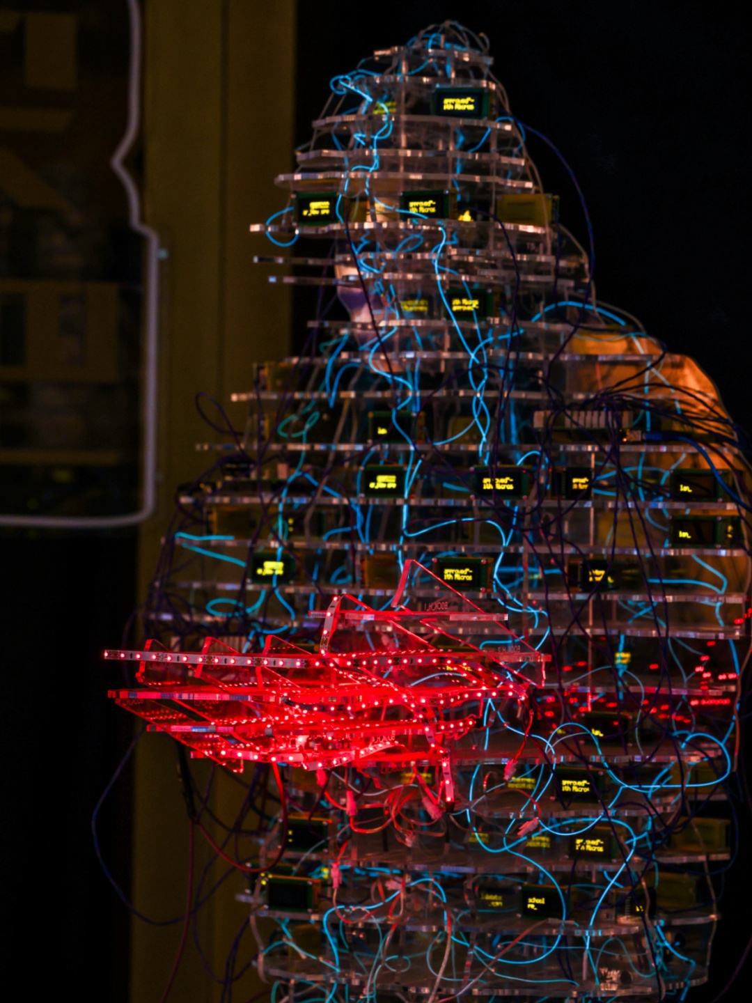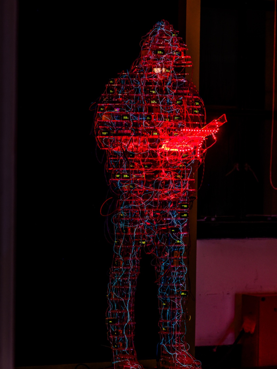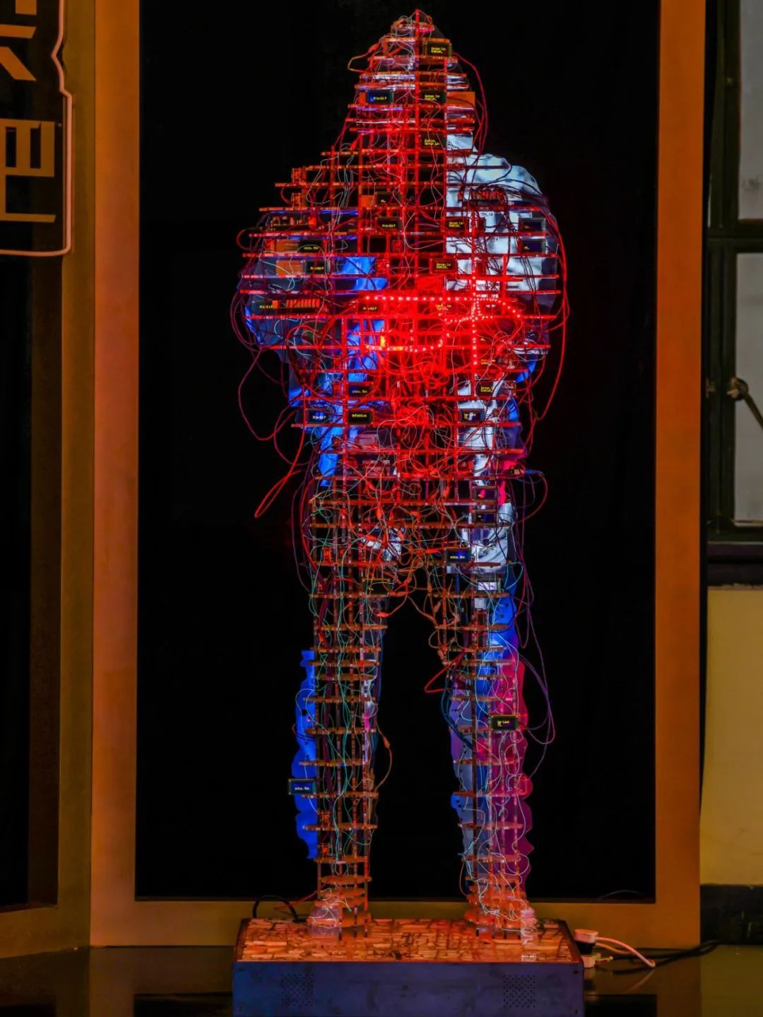 在西一馆上海景观照明成果回顾展中呈现的是英国艺术家STAZA的作品《阅读者》(《The Reader》)。配备了定制电子设备,模拟未来人的身体将嵌入传感器和海量数据的情况。艺术构思上将LED灯与城市数据相结合,让观众能够回应更广泛的集体空间问题。有观众评价:“该作品意喻着我们的气质里,藏着走过的路、读过的书、爱过的人……”。