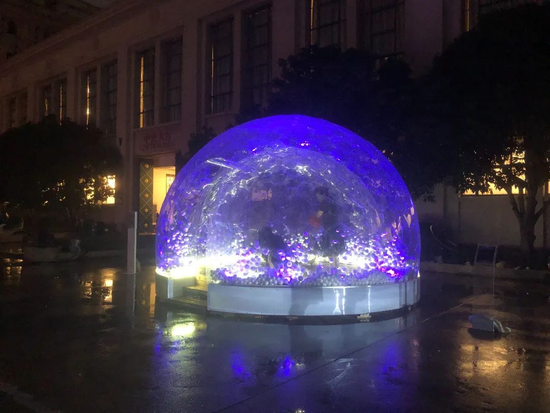 《嗨梦》(Shang‘High’Dreams)是法国和摩纳哥艺术家组合LNLO为上海国际光影节特别设计的作品,10个美丽的彩色球体装置坐落在户外广场上,将广场变成一个闪烁的蒲公英的海洋,当你胸怀梦想和希望对着它们吹气时,你会发现这些蒲公英会用美丽的灯光效果予以你回应。“嗨梦”象征着上海国际光影节想要传达给大家的希望和梦想的力量。现场观众积极参与互动,引出了不少特别的灯光效果。
