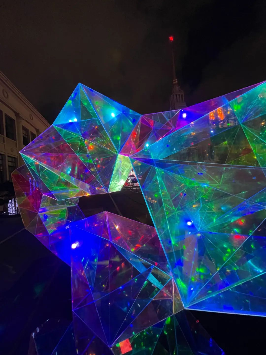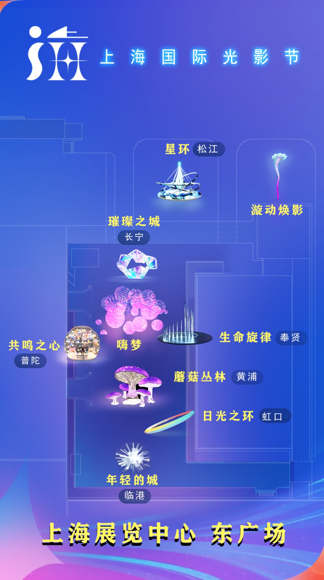 《年轻的城》是本次装置展最大型的一件作品,装置设计构思来自临港片区“年轻的城,年轻人的城”的发展愿景,通过视觉、声效与互动的结合,由苏醒、聚能、逐梦三个章节逐渐将内容推向高潮,观众能够亲身感受到科技与艺术的交织,置身于一个充满未来感的虚拟星空。人们在星辰世界中不断突破界限,年轻之心勇敢逐梦。本次光影节主会场结束后,将在临港滴水湖畔永久落地。