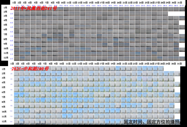 会上,江苏省环境监测中心主任单阳展示了2份空气质量日记,分别由2013年和2023年在省监测中心办公地拍摄的照片组成,可以看到,日记上的“黄泥天”“灰霾天”在减少,“水晶蓝”在增多。