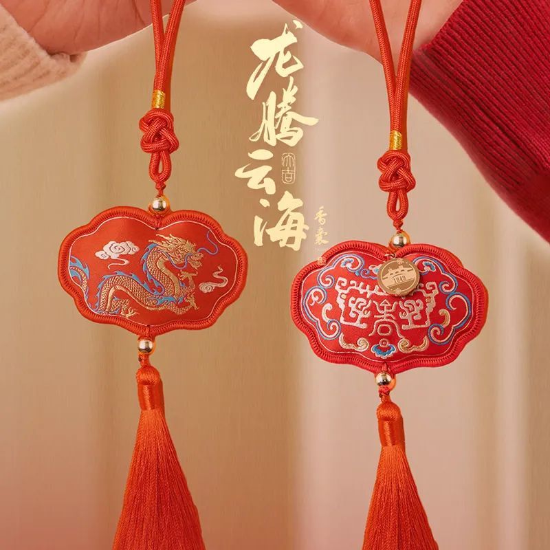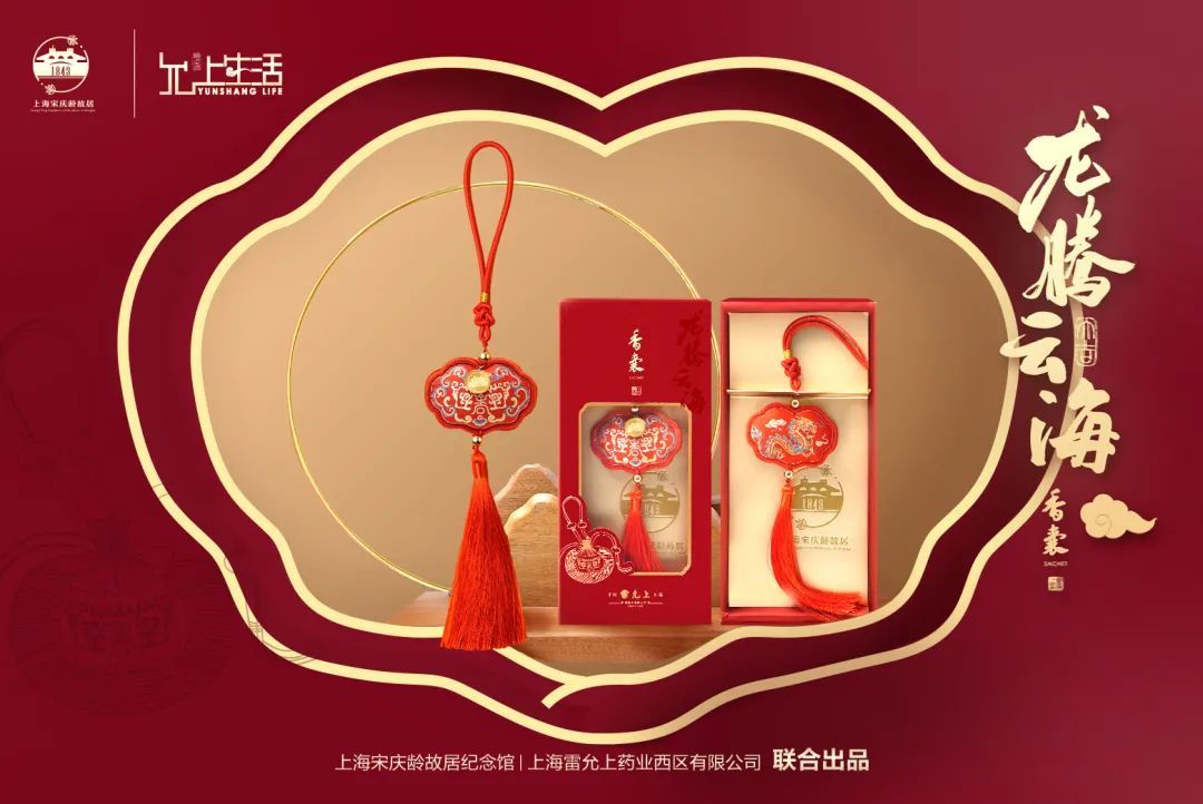 由上海雷允上药业西区有限公司与宋庆龄故居联袂出品,设计灵感取自宋庆龄儿时佩戴过的一枚香袋。香囊以长命锁为整体造型,一面匠心复刻了原香袋文物上的龙纹及寿字图形,另一面结合传统中国龙形象,传递出龙乘祥瑞、温暖和美、长岁延年的美好寓意。