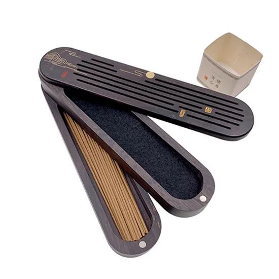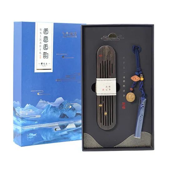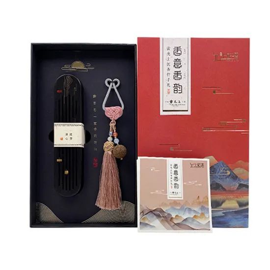 伴手礼中的沉香线香,按照《中国药典》的入药标准,选取地道莞香,配以精美的紫光檀香盒。燃香、存香双层一体化设计的香盒方便携带,即取即用。“中国红”和“水墨蓝”的包装设计既古典又时尚,营造出淡雅悠远的山水意境。