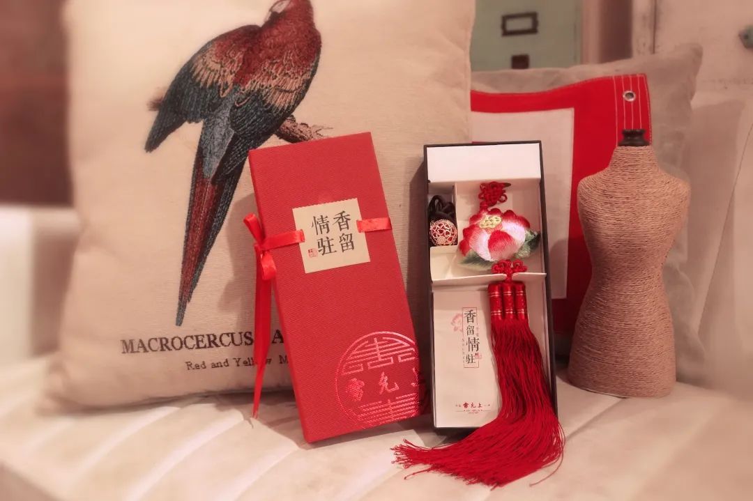 选用雷允上精研中药草本配方和传统苏绣工艺,并配以中国红的“长穗”,寓意长命百岁,祈福安康。盒面精巧的“香留情驻”设计运用了中国传统文化中的“回文”,巧妙地构成回字形读法,以小小香囊传递浓浓情谊。这款产品曾入选G20贸易部长会议唯一伴手礼。