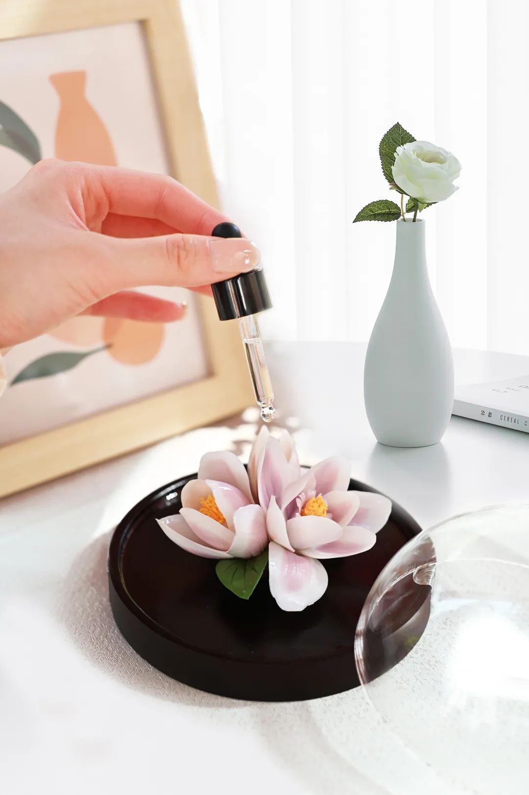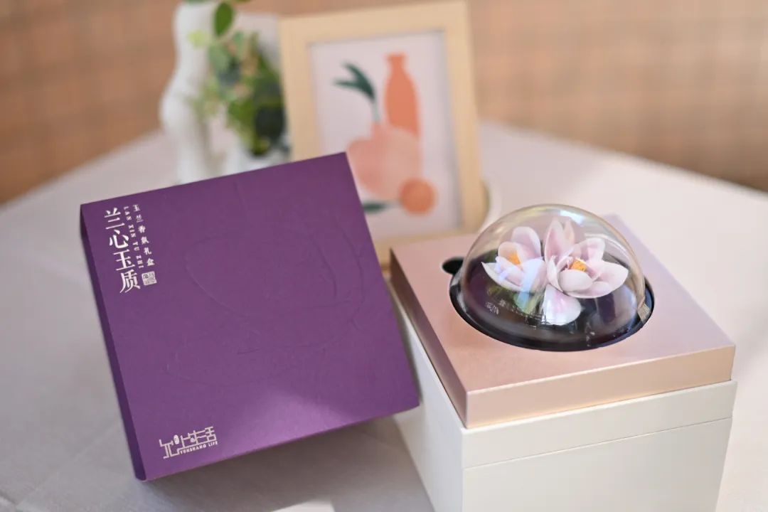 礼盒中的精油选取中药“辛夷”,经专研调香,散发玉兰清新。手捏玉兰瓷花扩香器,采用德化非遗技艺,经手作而成。将2-3滴精油滴于玉兰瓷花上,花香拂过;若滴上5-6滴,则芬芳满园。