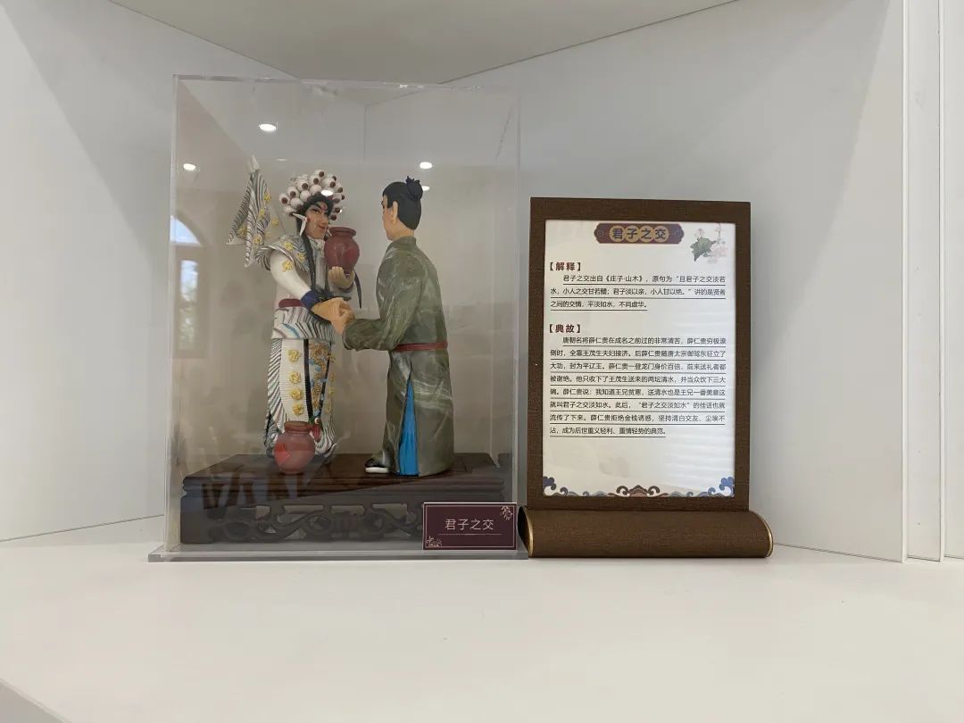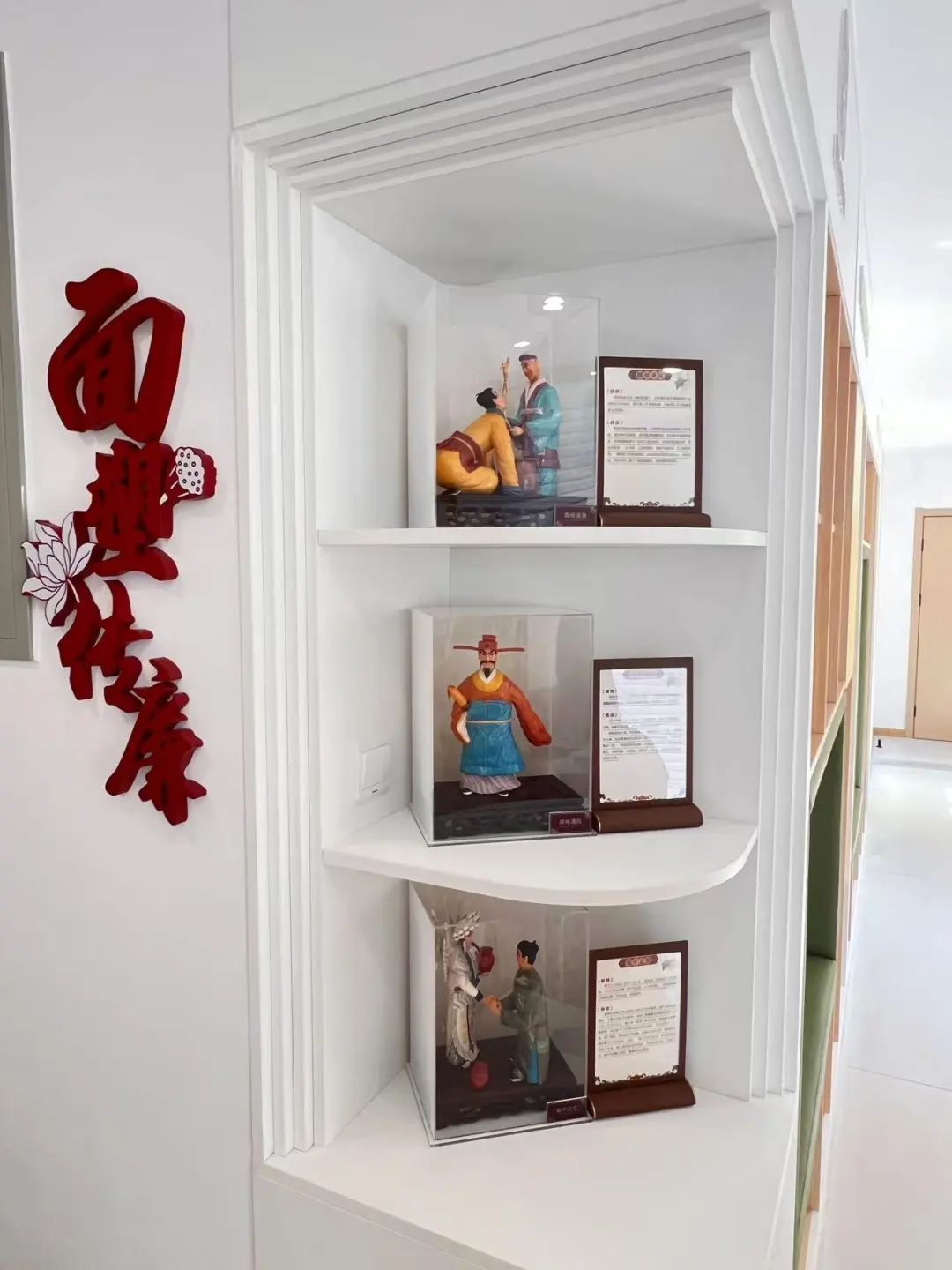 在这处以“面塑传廉”为主题的廉洁文化宣传角,三组面塑作品被安放在透明展示柜中,一旁的立牌上有详细的文字说明,向来者讲述面塑作品演绎的故事。