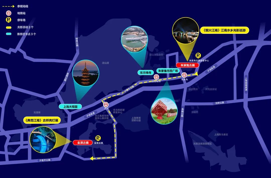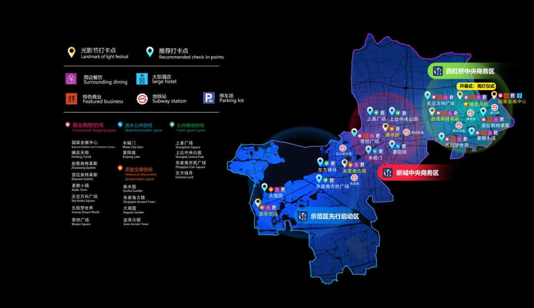 本次光影节分为西虹桥商务区、新城中央商务区、示范区先行启动区三大区块,交相辉映,展现不同的魅力青浦光影美景。
