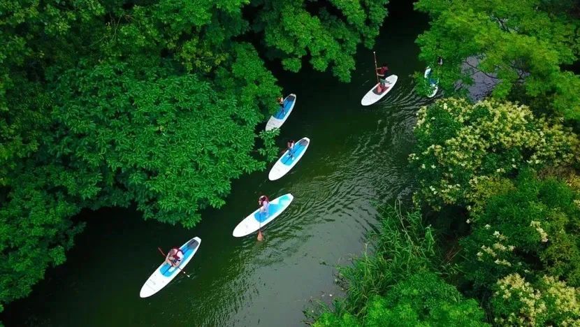 位于青浦水乡金泽镇的岑卜村,一面向水,三面环林,丛林水道酷似热带雨林,被誉为魔都的“小亚马逊”,成为了沪上桨板和皮划艇爱好者的快乐家园。