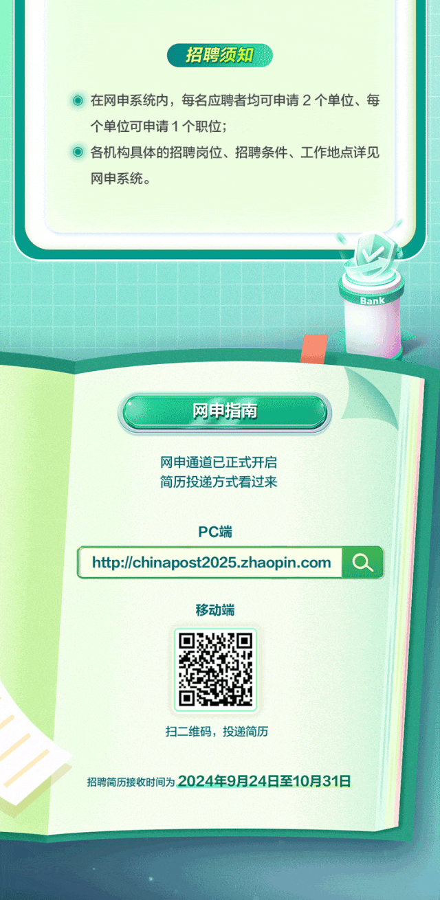 中国邮政2025年联合校园招聘正式启动。有意者可于10月31日前,详见文末“网申指南”登录招聘网址投递简历。详见↓