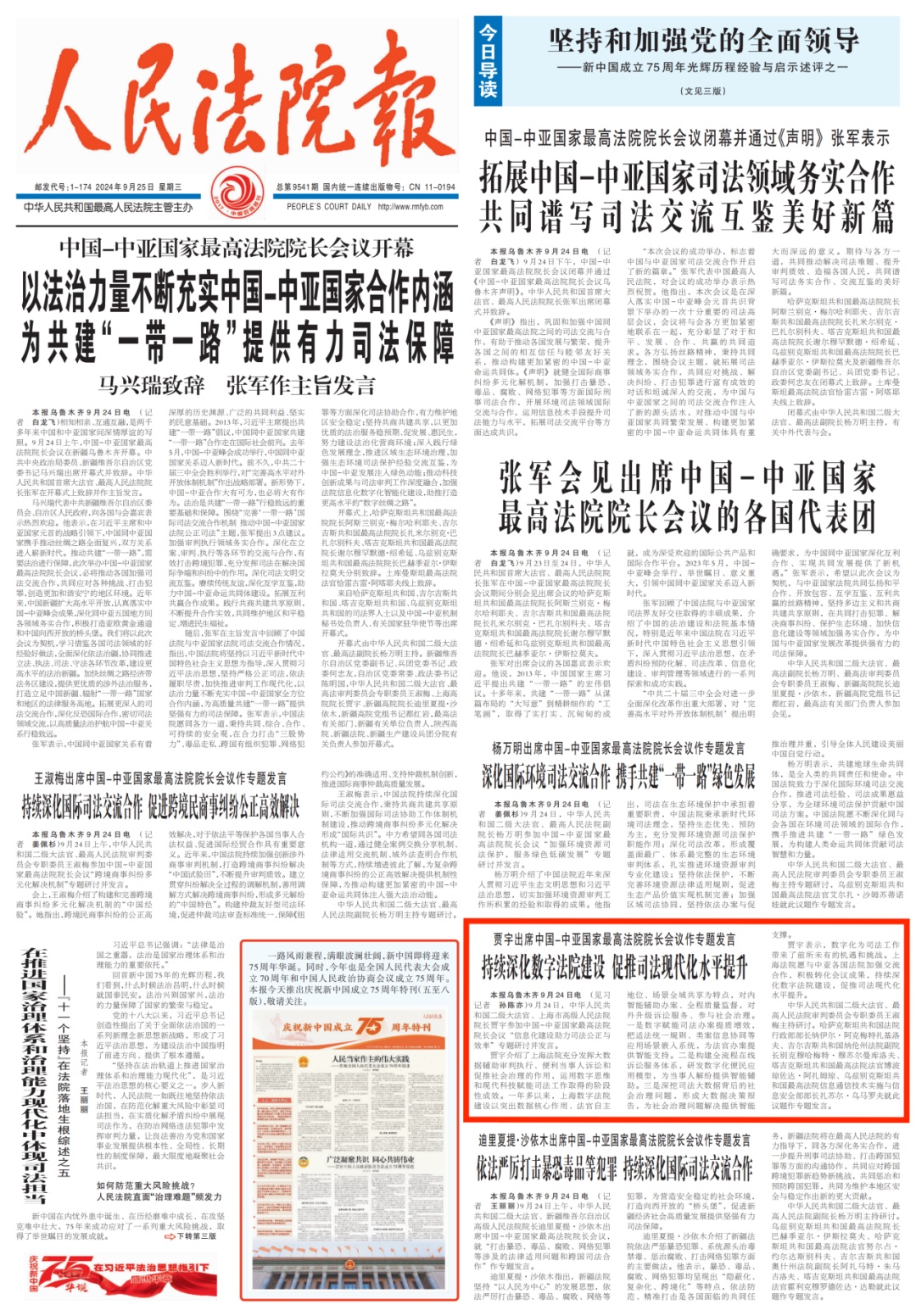 9月24日,中华人民共和国二级大法官、上海市高级人民法院院长贾宇参加中国-中亚国家最高法院院长会议“信息化建设助力司法公正与效率”专题研讨并发言。