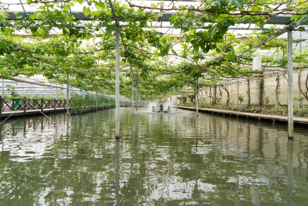 姜懿雯说,大棚的内部还采用了模仿中国古代水乡的“桑基鱼塘”模式,充分利用空间,实现生态循环。“我们的大棚主要就是三种结构,水下养鱼虾蟹,中间养蔬果植物,顶上爬葡萄,就是属于立体种养结合,很好地利用了空间,增加产量。”