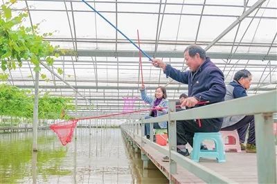除了参观仿热带雨林大棚采摘水果,品尝生态养殖的鱼虾蟹外,游客还能在农场里钓鱼、钓小龙虾、钓牛蛙、投喂锦鲤。