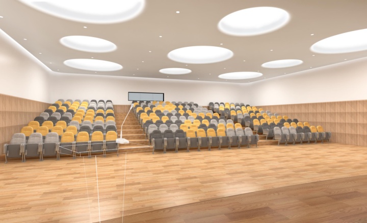 报告厅的设计充分考虑了功能性与美观性的结合。在选择彩色座椅时,除了注重色彩搭配,还特别关注了材质、舒适度和耐用性。优质的座椅确保了学生长时间使用的舒适度,而座椅的耐用性则保证了校园设施的长期经济效益,进一步提升了使用价值。