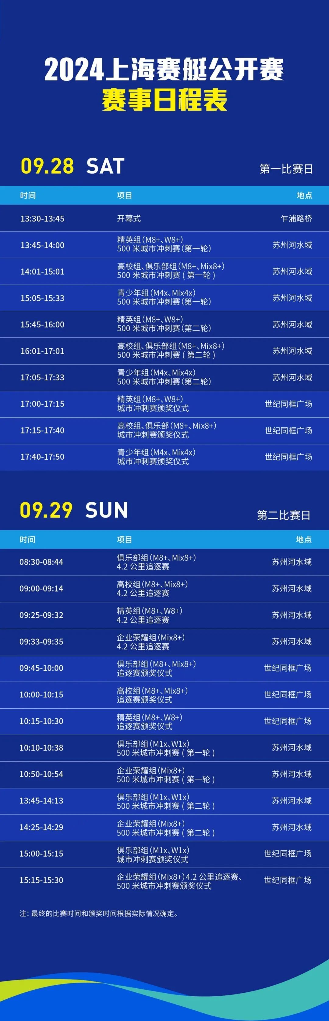 本次赛事分为精英组、高校组、俱乐部组、青少年组和荣耀企业组,设4.2公里追逐赛和500米城市冲刺赛。追逐赛和冲刺赛的终点均设在苏州河虹口段。