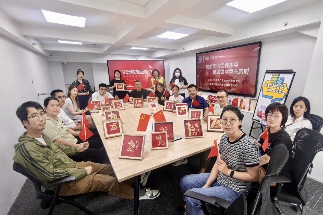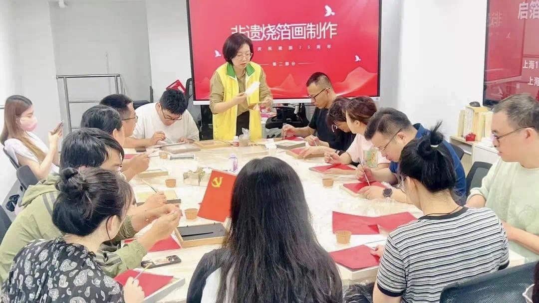 在国庆节来临之际,为丰富企业白领的精神文化生活,弘扬中华民族传统文化,街道党群服务中心携手108商业广场楼宇事务委员会,共邀上海市静安长庚健康管理中心来到108商业广场,开展“启箔光熠熠养生序 绘盛世华章共赏时”午间活动,带领园区白领共赴一场非遗传承之旅,为祖国献上最真挚的祝福。