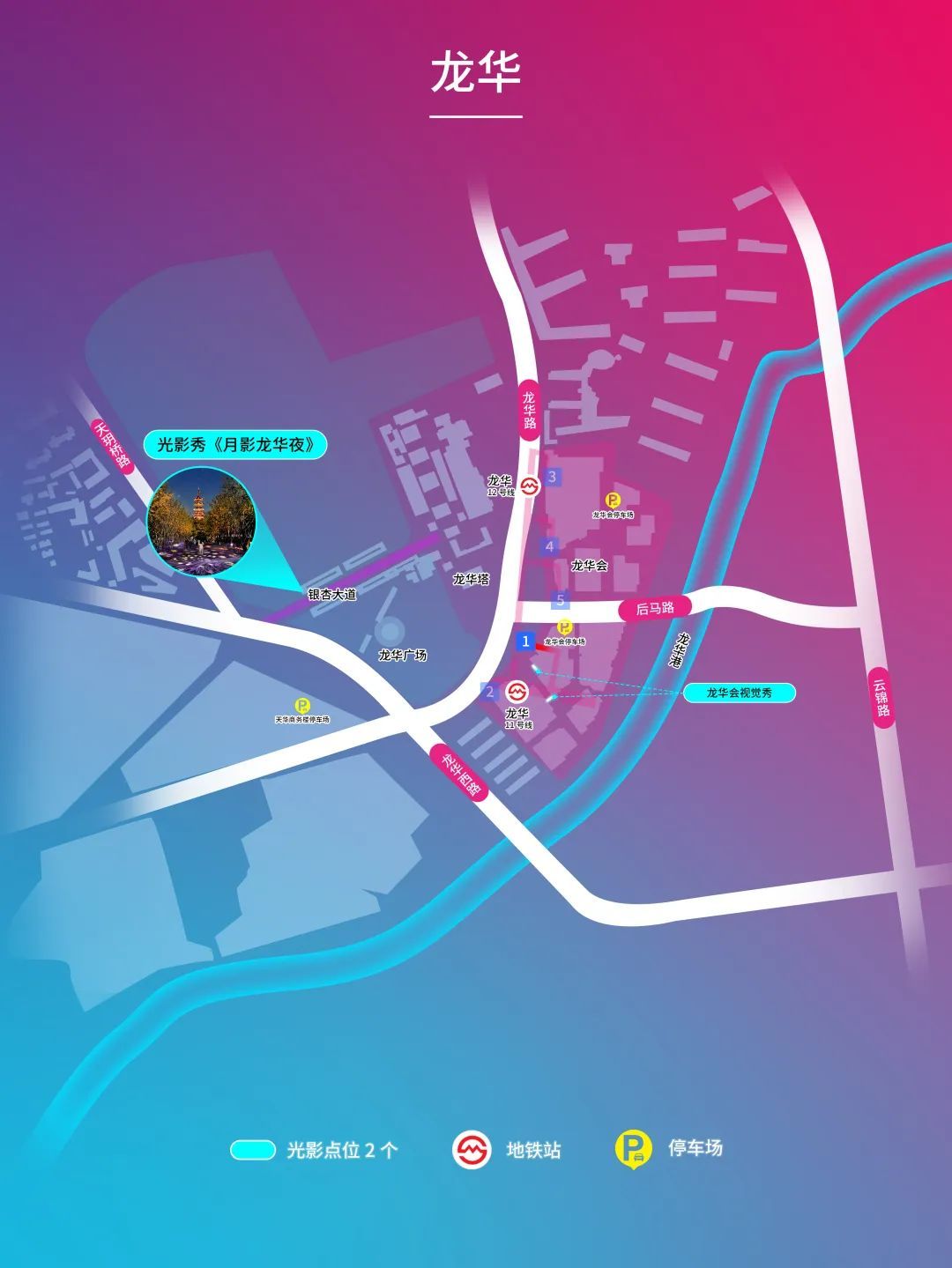 龙华历史风貌展区共有2个点位,银杏大道的光影秀《月影龙华夜》将龙华塔化作光影的舞台,将龙华古韵之美展现在人们眼前。